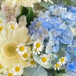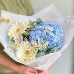 Этот букет — превосходное сочетание холодных тонов и жизнерадостного очарования, созданное, чтобы привнести нотку спокойствия и радости в любое пространство. В сердце этого букета — завораживающая голубая гортензия, её нежные лепестки источают умиротворение и спокойствие. Вокруг неё — яркие и игривые ромашки и герберы, добавляющие вспышки тепла и цвета. В букете переплетены веточки свежего эвкалипта, придающие лёгкий землистый аромат. Этот букет — идеальный подарок для любого случая, предлагая восхитительный баланс покоя и счастья в каждом лепестке.