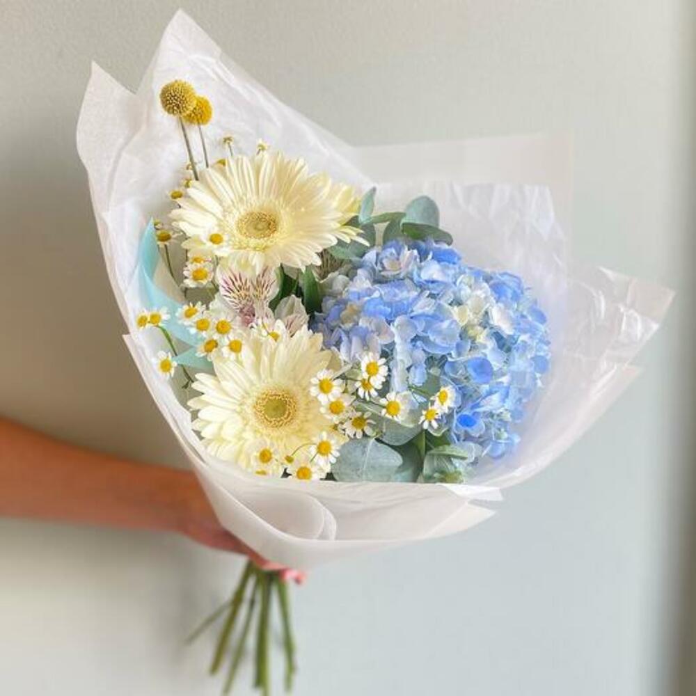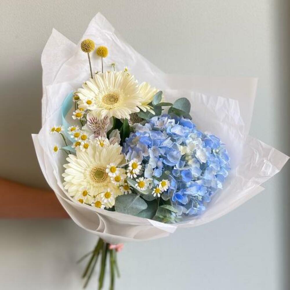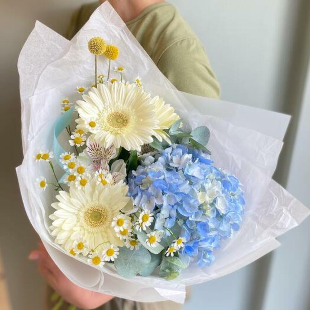 Этот букет — превосходное сочетание холодных тонов и жизнерадостного очарования, созданное, чтобы привнести нотку спокойствия и радости в любое пространство. В сердце этого букета — завораживающая голубая гортензия, её нежные лепестки источают умиротворение и спокойствие. Вокруг неё — яркие и игривые ромашки и герберы, добавляющие вспышки тепла и цвета. В букете переплетены веточки свежего эвкалипта, придающие лёгкий землистый аромат. Этот букет — идеальный подарок для любого случая, предлагая восхитительный баланс покоя и счастья в каждом лепестке.