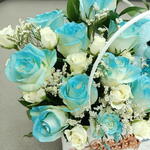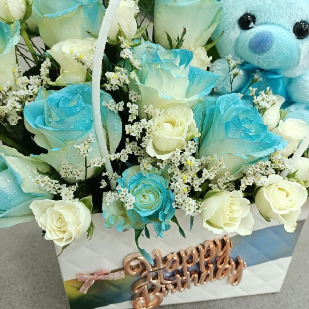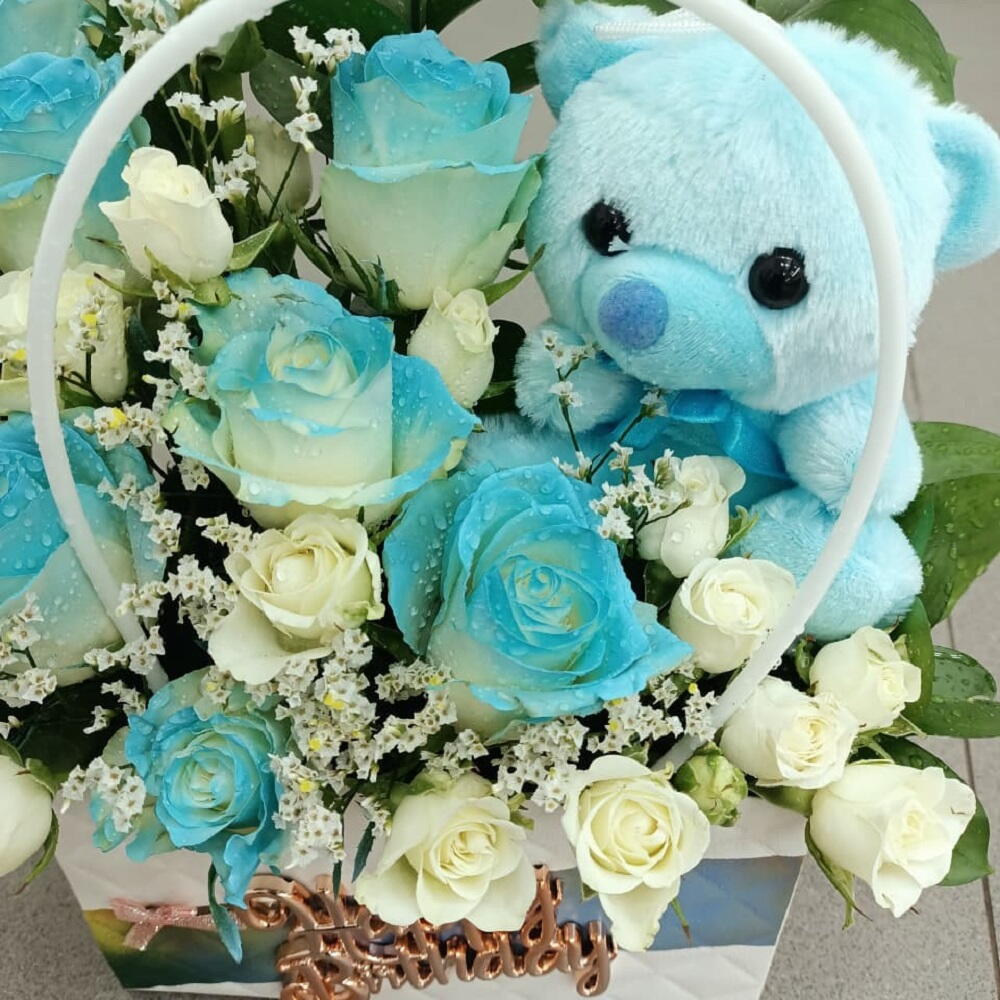Нежная и жизнерадостная композиция из синих и белых роз в сочетании с очаровательным голубым плюшевым мишкой, красиво оформленная в корзинке — идеально подходит для сюрпризов на день рождения и душевных праздников.