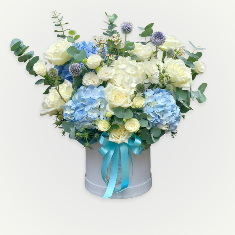 Eucalyptus - 2 шт. white box - 1 шт. голубые гортензии - 3 шт. белые гортензии - 1 шт. white roses - 5 шт. белые беби-розы - 1 шт.