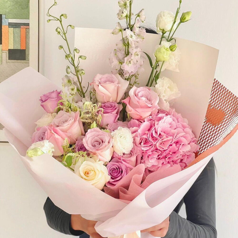 Нежный и очаровательный, этот букет — симфония мягких оттенков и изящных цветков. В нём сочетаются румяные тона роз сорта Faith, королевское очарование фиолетовых роз и вечная элегантность белых роз; композицию красиво дополняет белая эустома, придавая ей дополнительную изысканность. Мечтательная розовая гортензия добавляет пышный объём, а фиолетовый дельфиниум — причудливый ниспадающий акцент. Упакованный в нежно-розовую обёртку, этот букет излучает нежность и очарование, делая его идеальным подарком для празднования любви, благодарности или любого особого момента.