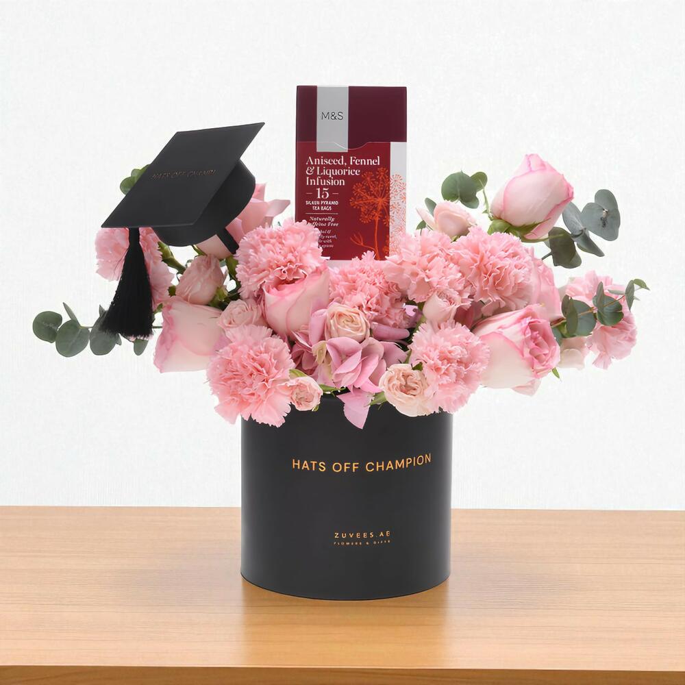 pink carnations - 9 шт. pink hydrangea - 1 шт. розовые спрей-розы - 5 шт. свежий эвкалипт - 5 шт. розы Эсперанс - 6 шт. топпер для выпускной шапочки - 1 шт. коробка чайных пакетиков ms с анисом, фенхелем и лакрицей - 1 шт.