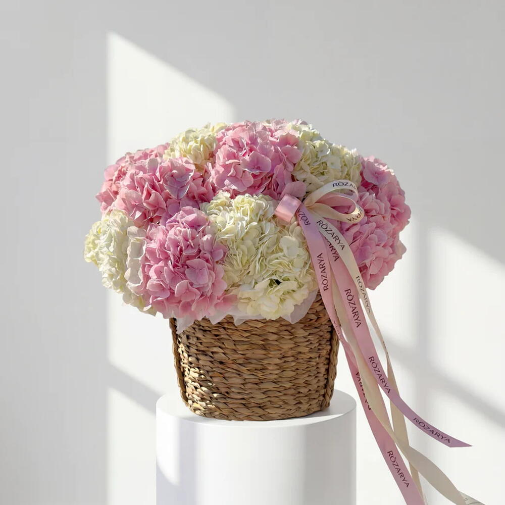 премиальные розовые гортензии - 12 шт. премиальные кремовые/белые гортензии - 10 шт. роскошная корзина глубокого плетения - 1 шт.