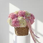 Нежная и элегантная корзинная композиция в оттенках румяно-розового и кремово-белого, оформленная пышной гортензией для полного, романтичного образа. Женственная, свежая и утончённая, эта композиция — прекрасный выбор для дней рождения, на День матери и в качестве продуманного подарка.