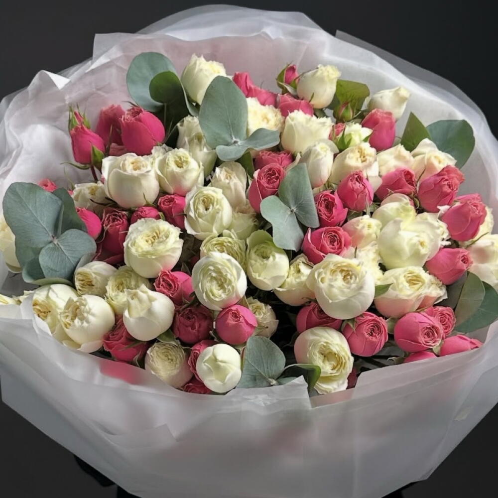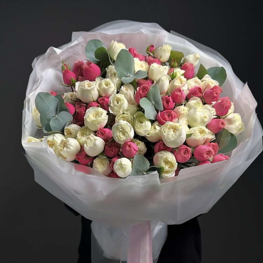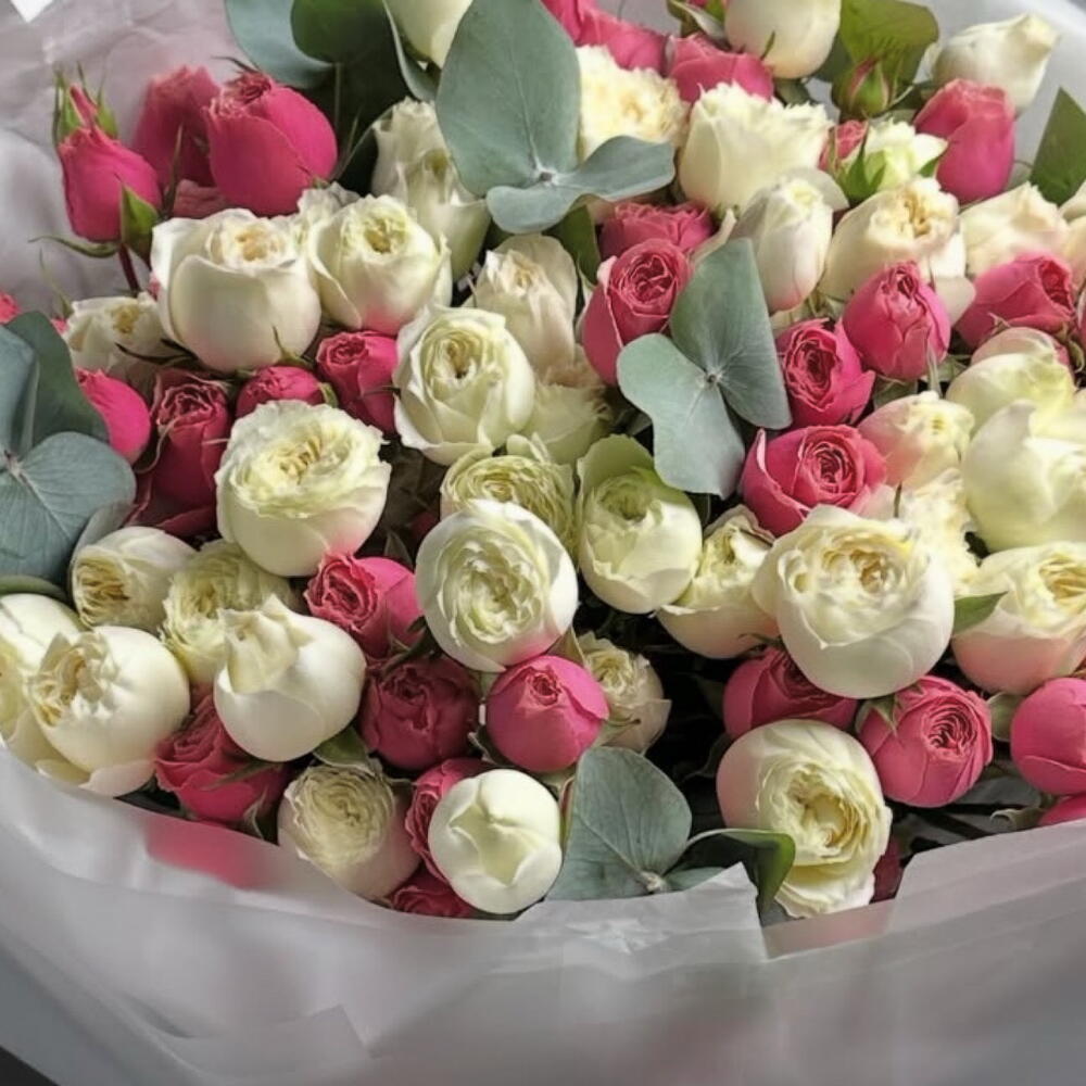 eucalyptus leaves - 5 шт. розовая садовая кустовая роза - 12 шт. белая садовая спрей-роза - 12 шт.