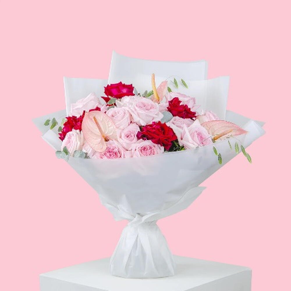 Букет «Blush Desire» — это изящное воплощение романтики и утонченности. Гармоничное сочетание нежно-розовых и насыщенно-красных роз дополняется нежными акцентами антуриумов и легкой зеленью, создавая образ, одновременно интимный и роскошный. Завернутый в элегантную полупрозрачную белую бумагу, букет демонстрирует легкую, воздушную эстетику, позволяя цветам занять центральное место. Мягкий контраст между нежно-розовыми и малиновыми тонами вызывает ощущение тепла, нежности и вневременной элегантности — делая этот букет прекрасным выбором для трогательных моментов.