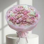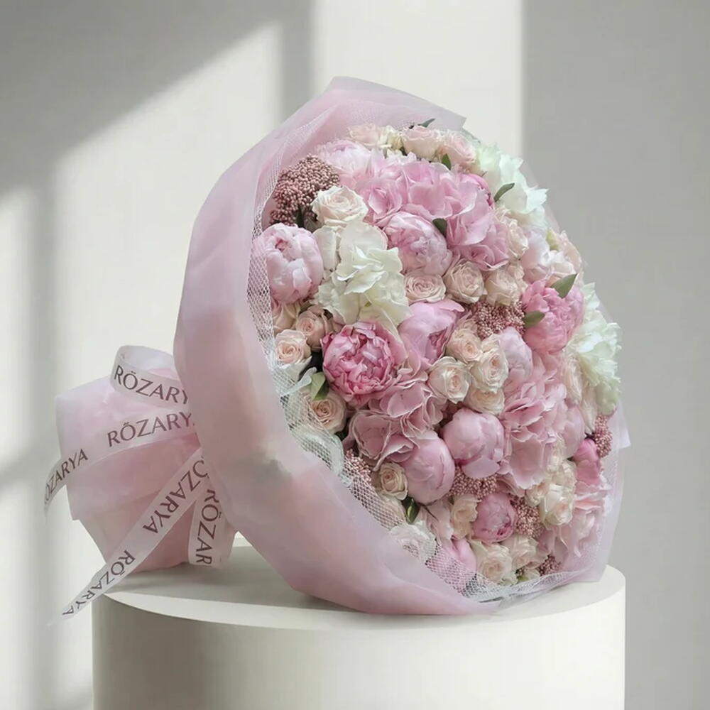 Пышный и романтичный букет в мягких оттенках румяно-розового и белого, составленный из роскошных пионов, воздушной гортензии, нежных кустовых роз, белого лизиантуса и фактурной розовой брунии. Элегантный, женственный и премиальный по стилю, этот букет — прекрасный выбор для дней рождения, Дня матери, Дня святого Валентина и особых праздников. • Пожалуйста, обратите внимание: так как цветы — природный продукт, их фактические цвета могут незначительно отличаться от цифровых изображений из‑за сезонного роста и условий освещения. Мы гарантируем, что общий стиль, премиальное качество и свежесть вашей композиции всегда будут сохранены.