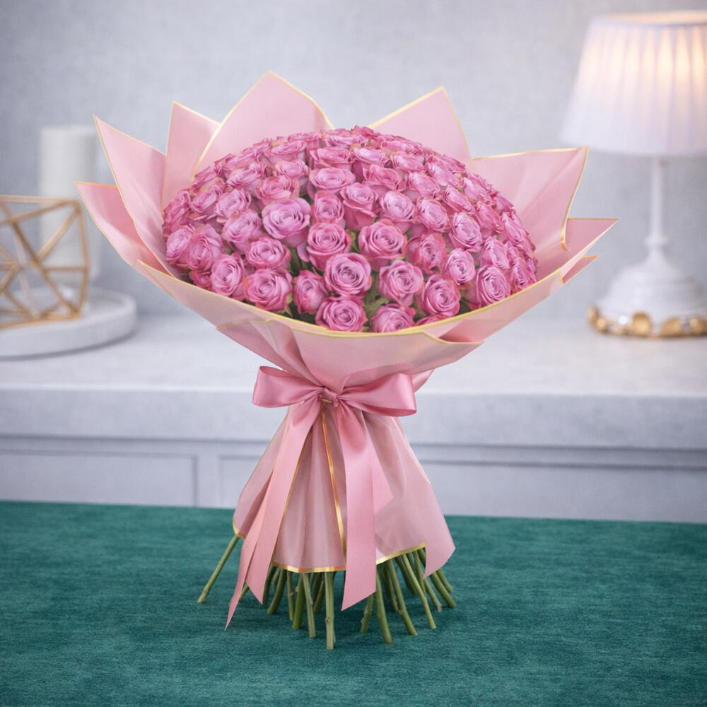 • 51 роза (40–50 см) • Красиво упаковано в розовую упаковку • Завязано розовым бантом