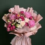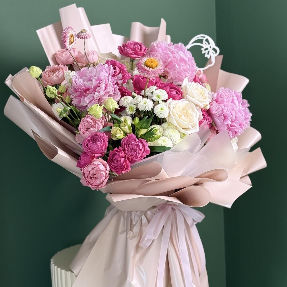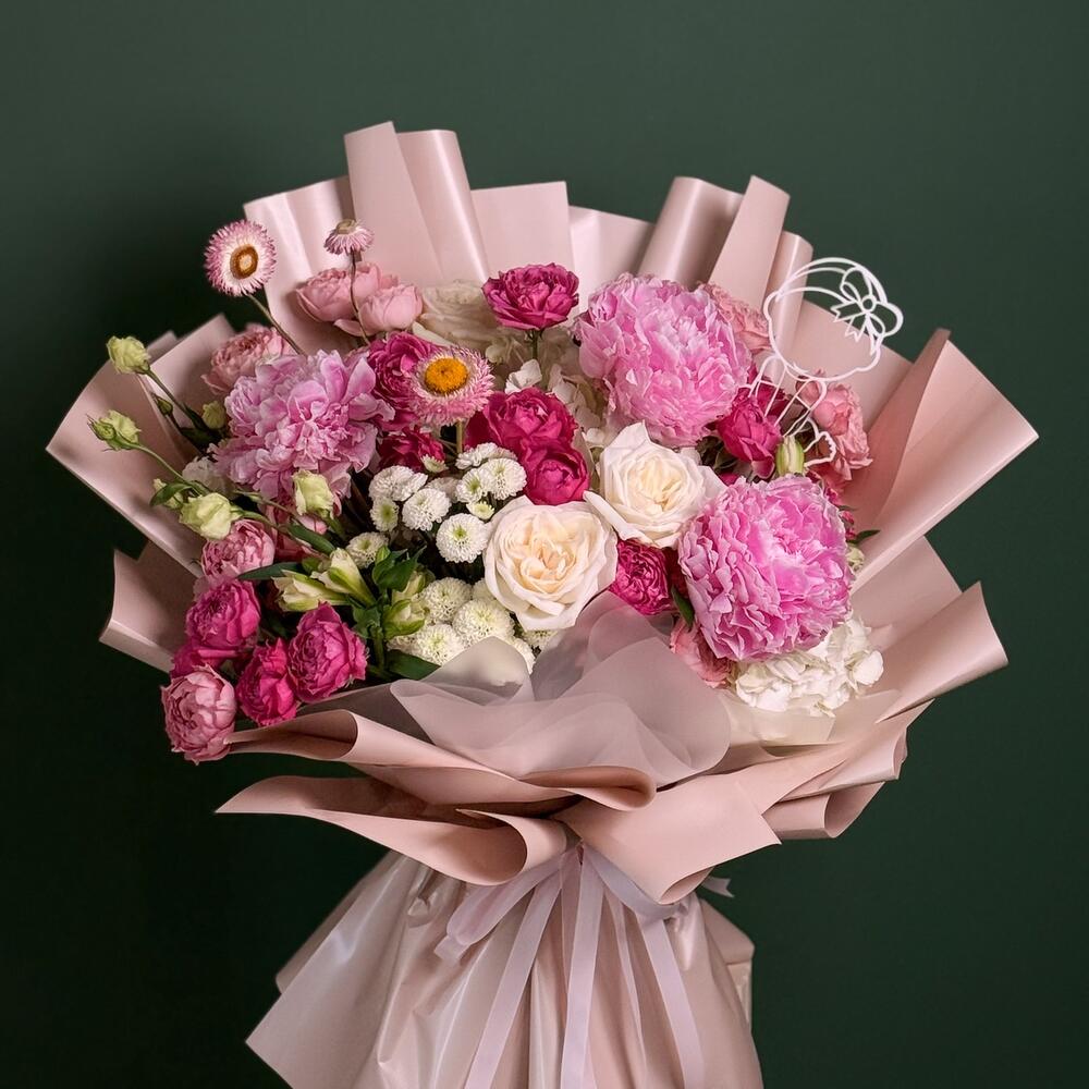 Роскошная композиция ручной работы, полная элегантности и очарования, «Blush Harmony Bouquet» представляет собой изящное сочетание розовых пионов, кустовых роз цвета фуксии, кремово-белых роз и жизнерадостных соломенных цветов. Акценты из нежных лизиантусов и изящных хризантем добавляют глубину и текстуру, а структурированная нюдово-розовая упаковка придаёт букету современный, скульптурный вид. Этот букет идеально подходит для чествования любви, красоты или душевного момента. Он производит яркое впечатление сочетанием романтических тонов и изысканного стиля.