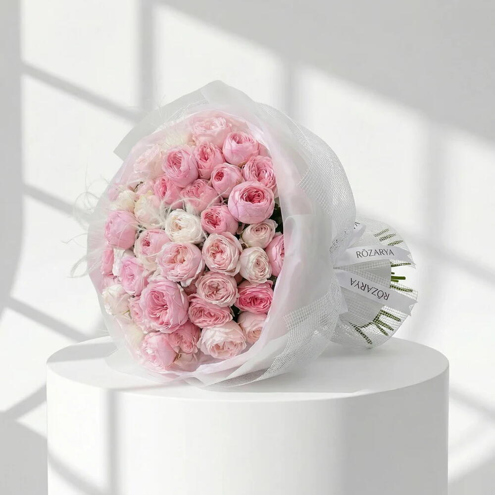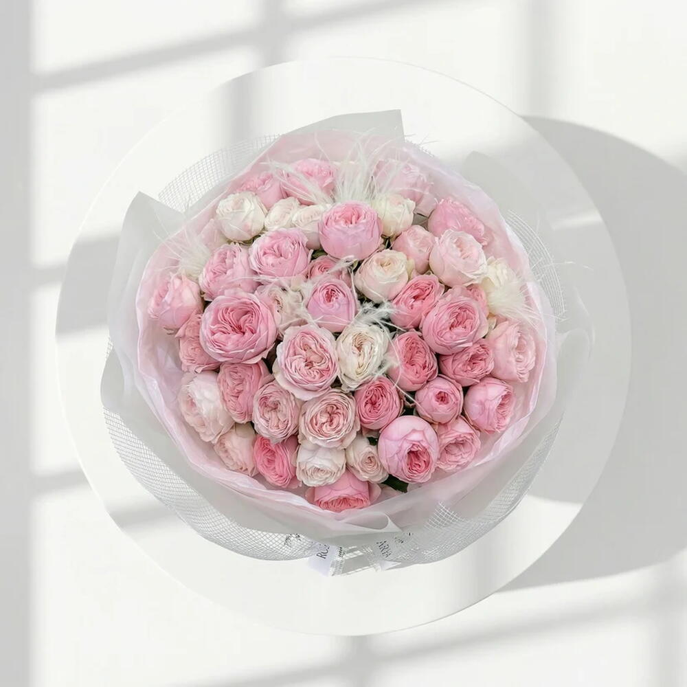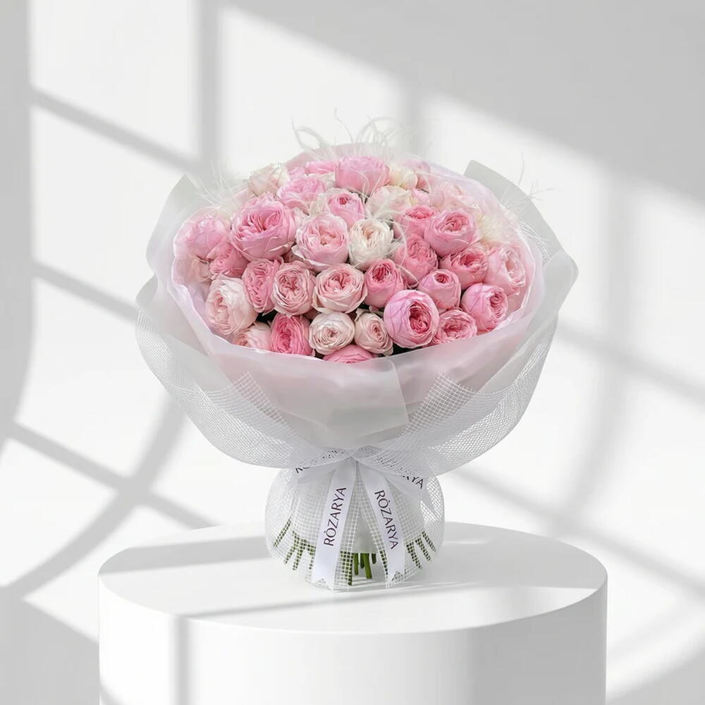 брендированная лента rozarya - 1 шт. белые / розовые кустовые розы - 51 шт. белые архитектурные перья - 5 шт. роскошная сетчатая упаковка «cloud» - 1 шт.