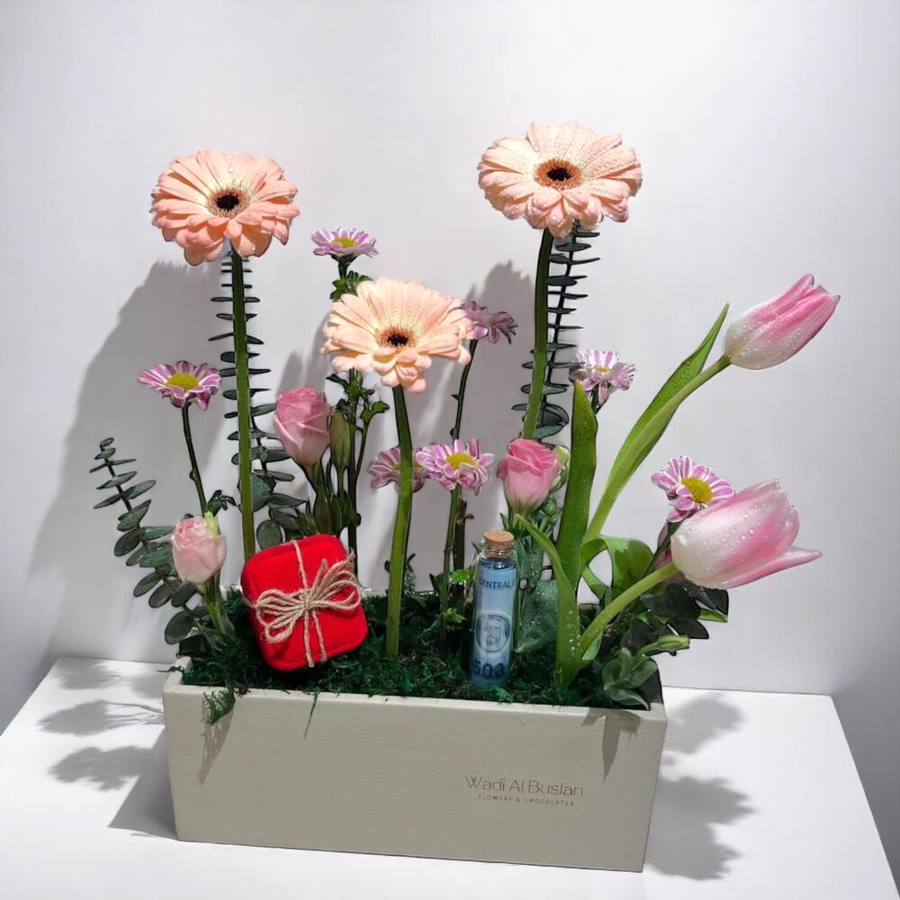 Цветочная коробка Blush Garden с подарочной подарочной бутылкой для денег – герберы, тюльпаны, розы