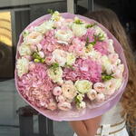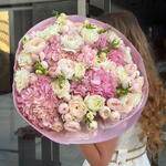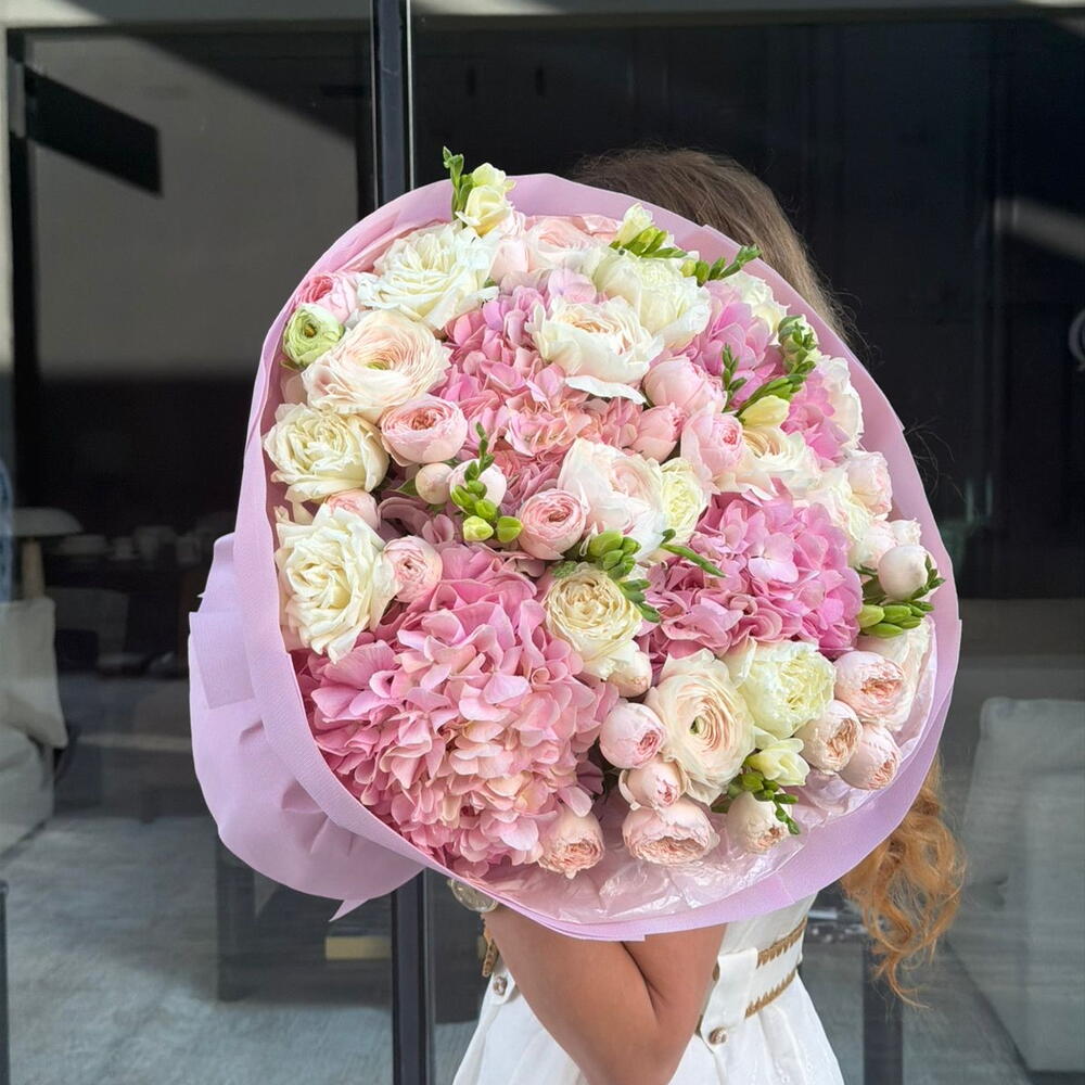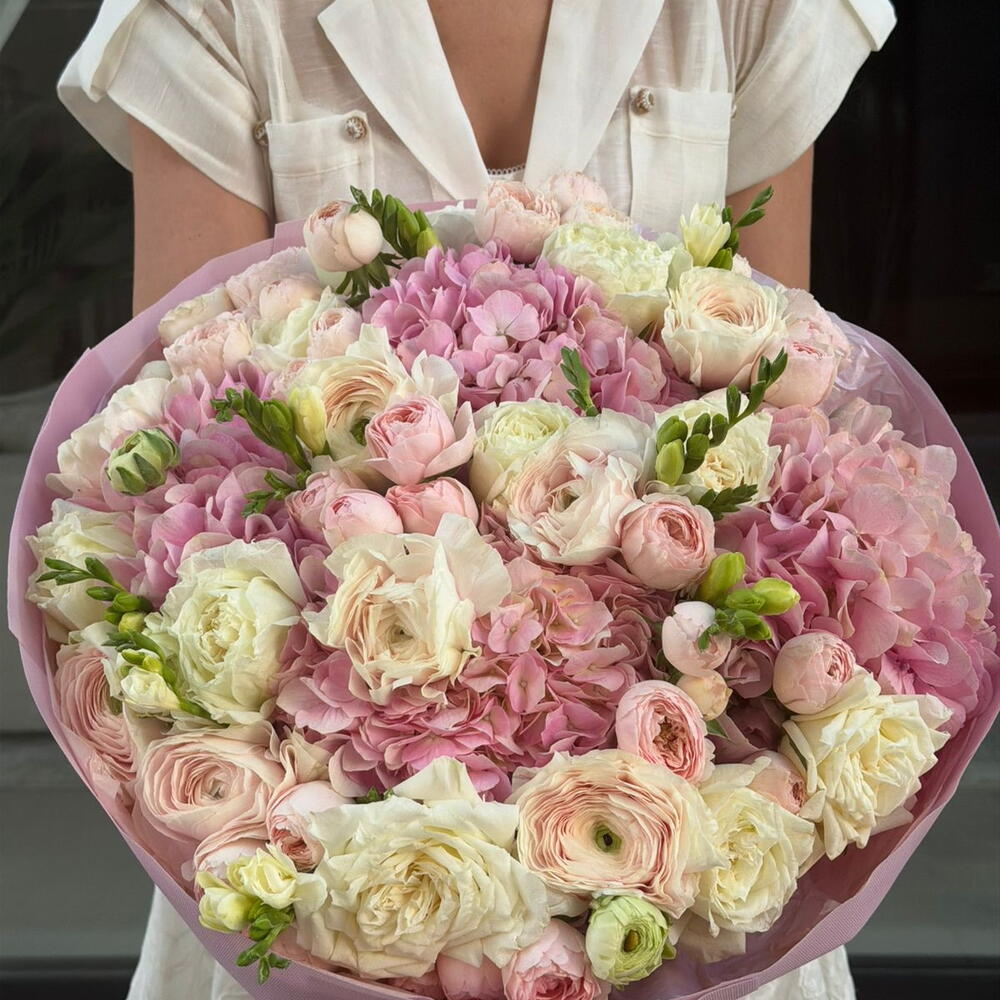 hydrangea pink - 4 шт. freesia white - 7 шт. ranunculus - 10 шт. роза тенник - 8 шт. спрей роз Мэнсфилд - 8 шт.