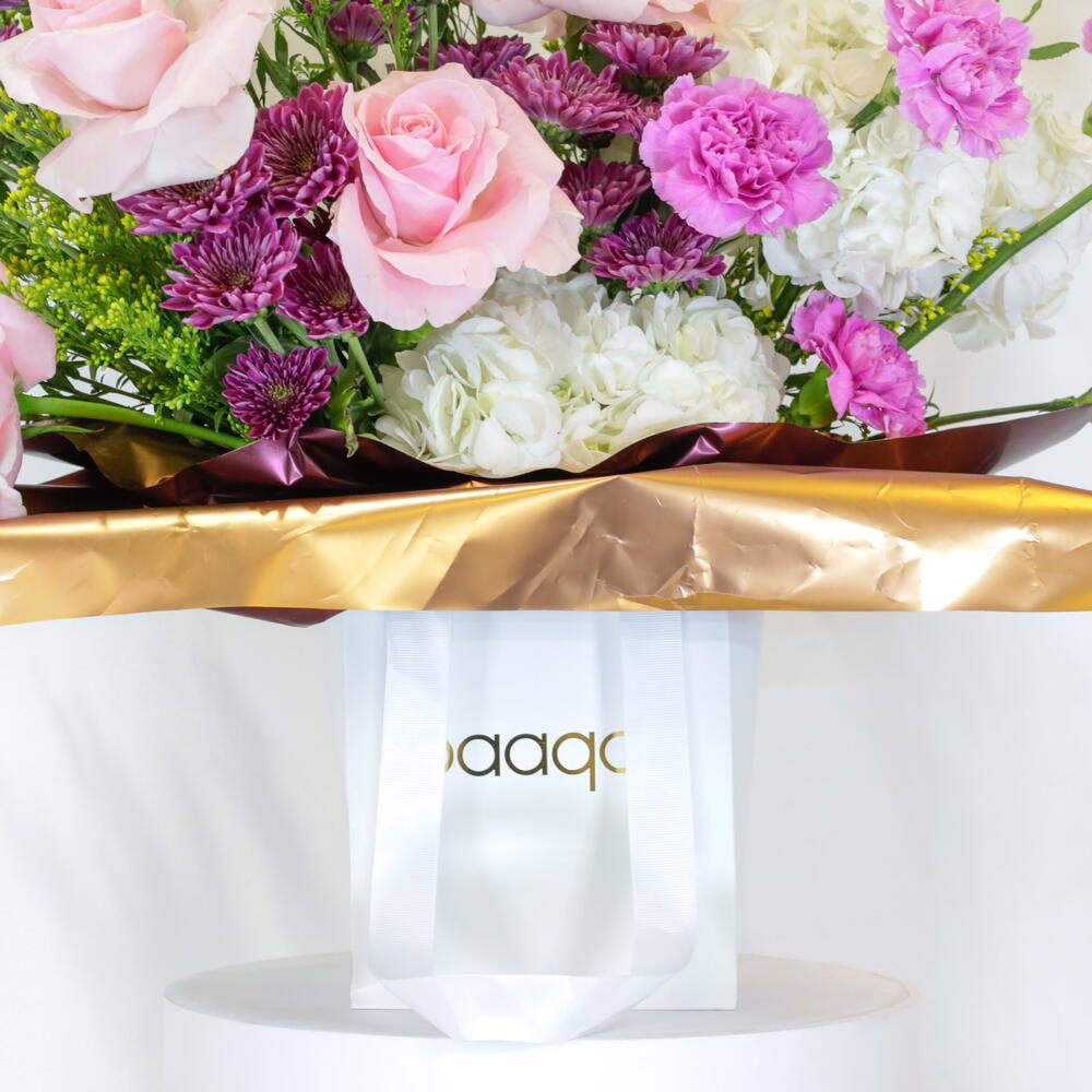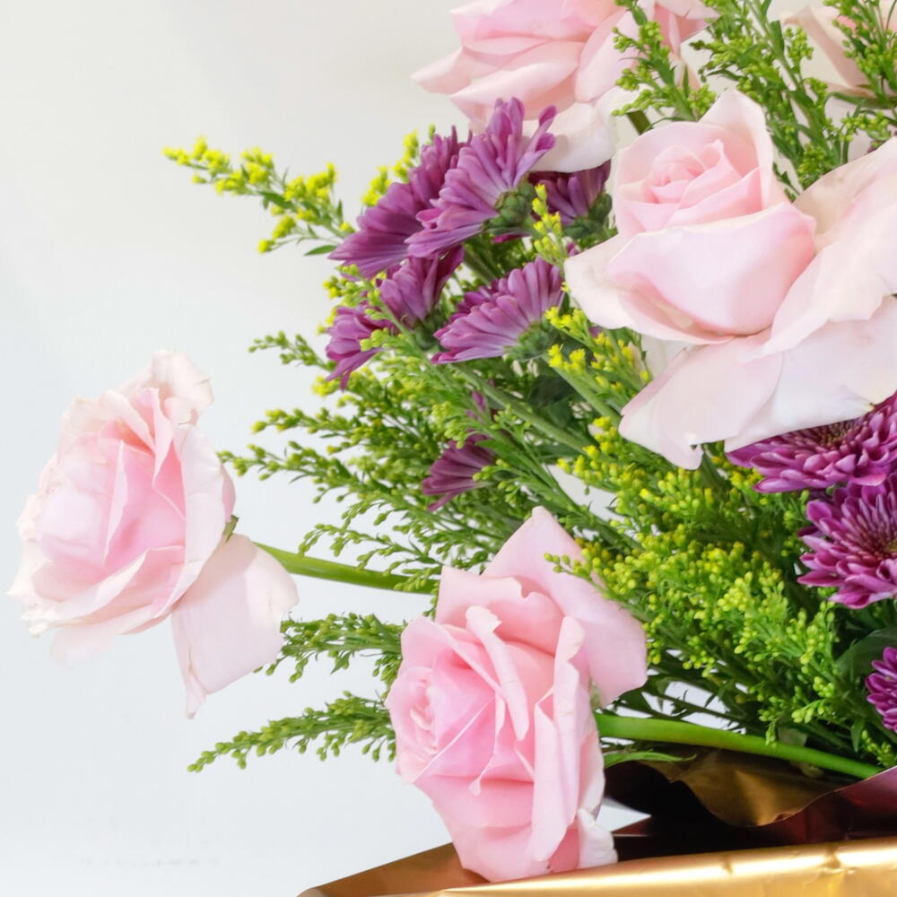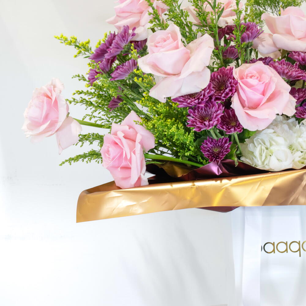 Побалуйте себя роскошной красотой цветочной коробки «Мягкий романс» – пленительной композиции, созданной, чтобы восхищать и впечатлять. Этот роскошный центральный элемент украшен пышным гобеленом из нежно-розовых роз и нежных белых гвоздик, которые прекрасно контрастируют с яркими темно-фиолетовыми акцентами и игривыми розовыми кустовыми гвоздиками. Эта композиция, упакованная в стильную коробку с эффектной золотистой металлической отделкой, готова к использованию и мгновенно украсит любое пространство. Это идеальное выражение искренних поздравлений, изысканный подарок на день рождения или потрясающий способ просто признаться в любви. Подарите момент чистой, элегантной радости. Представляемые цветы: розовые розы премиум-класса, белые гвоздики, фиолетовый левкои/лимониум, розовые кустовые гвоздики и фактурная зелень. Стиль: современная, пышная и сдержанная композиция в коробке. Подходит для: годовщин, пожеланий выздоровления, Дня матери или просто роскошного подарка. Уход за цветами в вашей композиции в коробке Ежедневный полив: аккуратно наливайте около половины стакана свежей холодной воды в центр композиции каждый день или через день. Поливайте медленно и осторожно, чтобы флористическая пена впитала воду. Храните в прохладном месте: поставьте композицию в прохладное место, вдали от прямых солнечных лучей, вентиляционных отверстий и сквозняков (например, кондиционеров). Это предотвратит быстрое высыхание цветов. Избегайте фруктов: не ставьте цветы рядом со спелыми фруктами, особенно с бананами, так как они выделяют газ этилен, который вызывает быстрое увядание цветов. Удаление увядших соцветий: по мере увядания отдельных цветов аккуратно отщипывайте или обрезайте их. Это поможет композиции выглядеть свежей и перенаправит воду к более здоровым цветам.