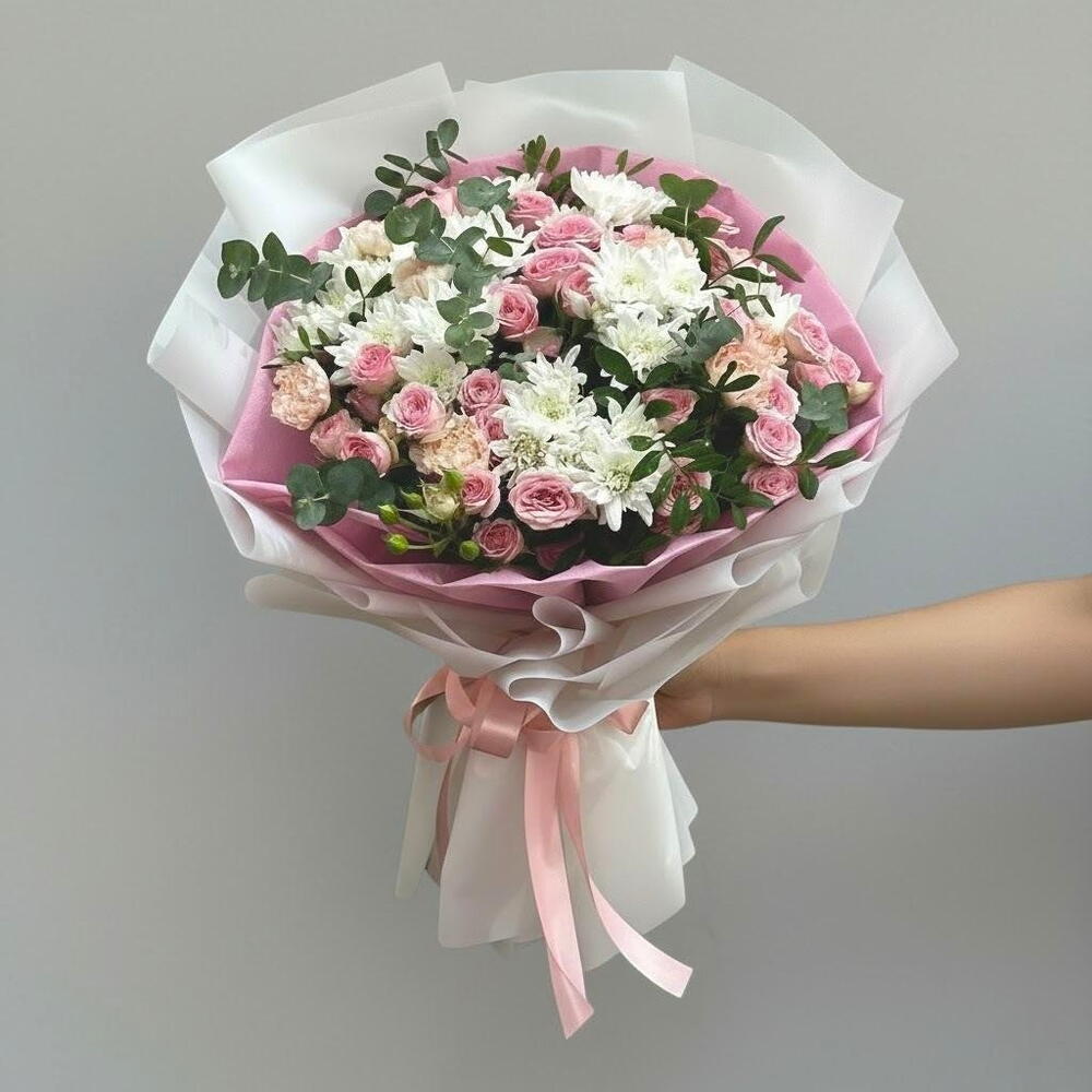 Нежный, изящный и прекрасно сбалансированный, Blush Harmony — очаровательный букет, созданный, чтобы выразить теплоту и элегантность. В его составе — нежные розовые спрей‑розы, мягкие розовые гвоздики и свежие белые хризантемы; композиция дополнена ароматной эвкалиптовой зеленью для естественной, успокаивающей нотки. Аккуратно упакованный в премиальную двойную обёртку с мягкой тишью, этот букет идеально подходит для дней рождения, юбилеев, в знак благодарности или просто чтобы порадовать кого‑то.