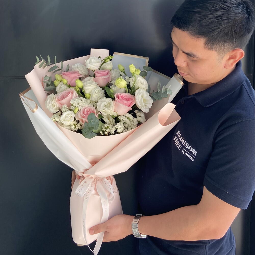 Слоновая кость с румянцем | Розовые розы | Белые лизиантусы | Розово-белый букет