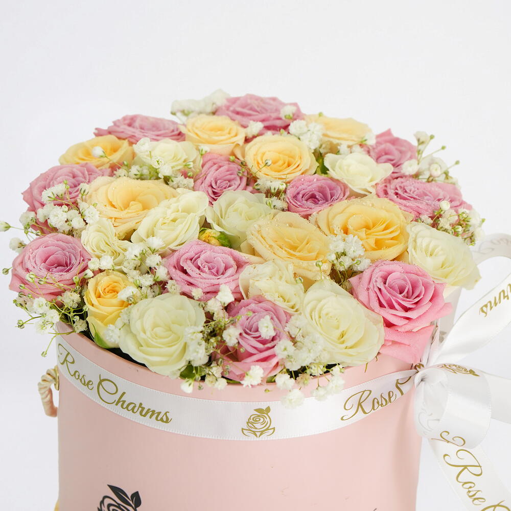 Коробка бледно-розовых и кремовых роз