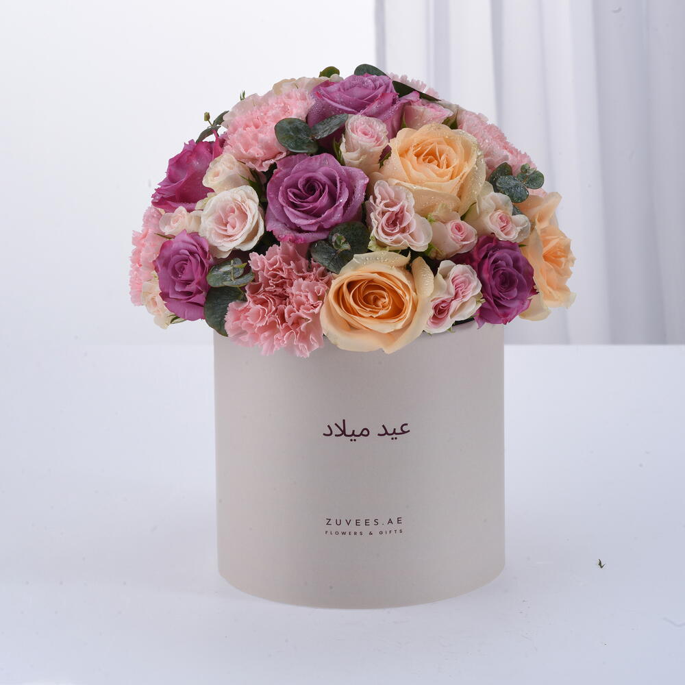 Идеально для: дня рождения, годовщины, поздравлений Идеально для: неё, него Идеально для: жены, мужа, девушки, парня, друга Эта изысканная композиция, сочетающая в себе нежно-персиковые, элегантные фиолетовые и нежно-розовые оттенки, украсит любое торжественное событие. Будь то сюрприз на день рождения или душевное торжество, эта цветочная коробка — идеальный способ выразить любовь, признательность и радость. Размеры товара: ширина 24 см, высота 27 см