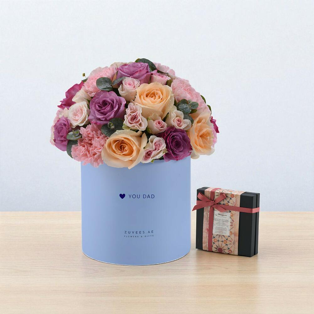 Изысканное сочетание тёплых персиковых, благородных фиолетовых и нежных розовых оттенков — эта цветочная коробка символизирует восхищение, любовь и признательность за силу и тепло, которые отцы привносят в нашу жизнь.