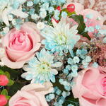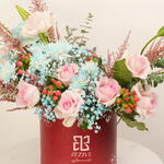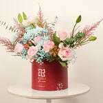 Погрузитесь в чистую элегантность этого букета Flower Box. Красиво размещённый в бордовой круглой коробке, он содержит изысканную подборку из 10 белых лилий, 10 белых хризантем, 10 розовых роз привлекательного оттенка и 10 фиолетовых астрений, яркость которых наверняка порадует любого. Композиция затем украшена 5 изящными розовыми астильбами для деликатного акцента. Каждый элемент тщательно подобран, чтобы создать идеальный баланс между элегантностью и очарованием, что делает его идеальным подарком для любого случая.