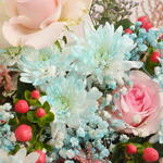 Chrysanthemum white - 10 шт. rose pink - 15 шт. lily white - 10 шт. zezzle бордовая круглая коробка - 1 шт. астильба розовая - 5 шт.