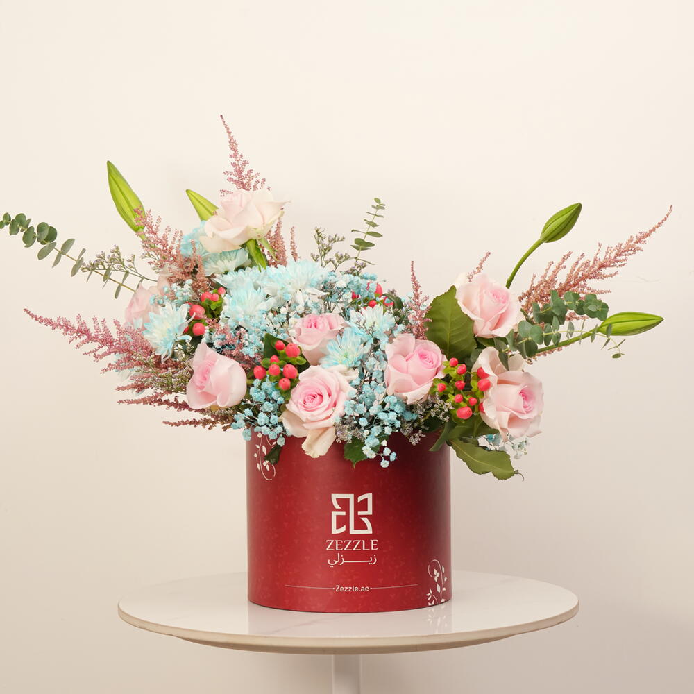 Погрузитесь в чистую элегантность этого букета Flower Box. Красиво размещённый в бордовой круглой коробке, он содержит изысканную подборку из 10 белых лилий, 10 белых хризантем, 10 розовых роз привлекательного оттенка и 10 фиолетовых астрений, яркость которых наверняка порадует любого. Композиция затем украшена 5 изящными розовыми астильбами для деликатного акцента. Каждый элемент тщательно подобран, чтобы создать идеальный баланс между элегантностью и очарованием, что делает его идеальным подарком для любого случая.