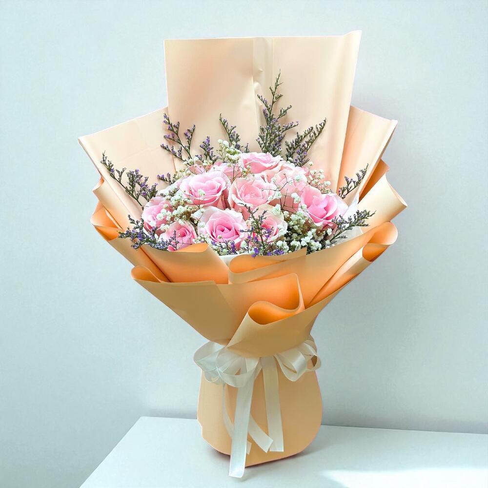 Gypsophila - 5 шт. лимониум пурпурный - 3 шт. pink roses - 15 шт.