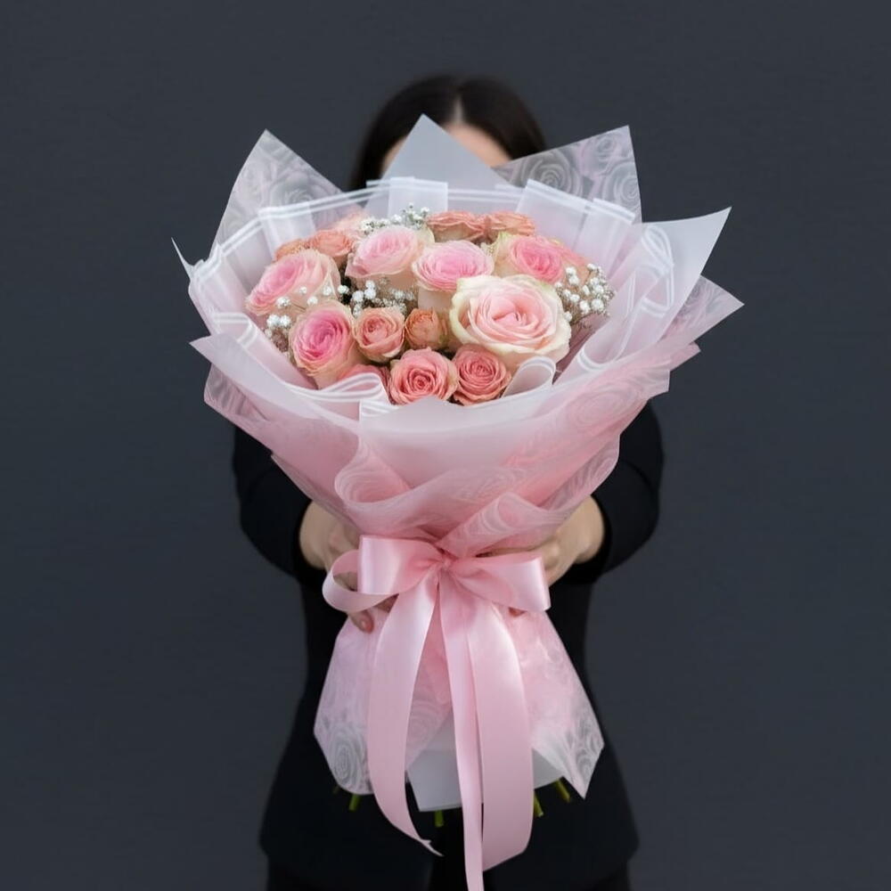pink roses - 10 шт. нежно-розовые розы - 7 шт. лист упаковочной бумаги - 6 шт. светло-розовая атласная лента - 1 шт. наполнение гипсофилой - 1 шт.