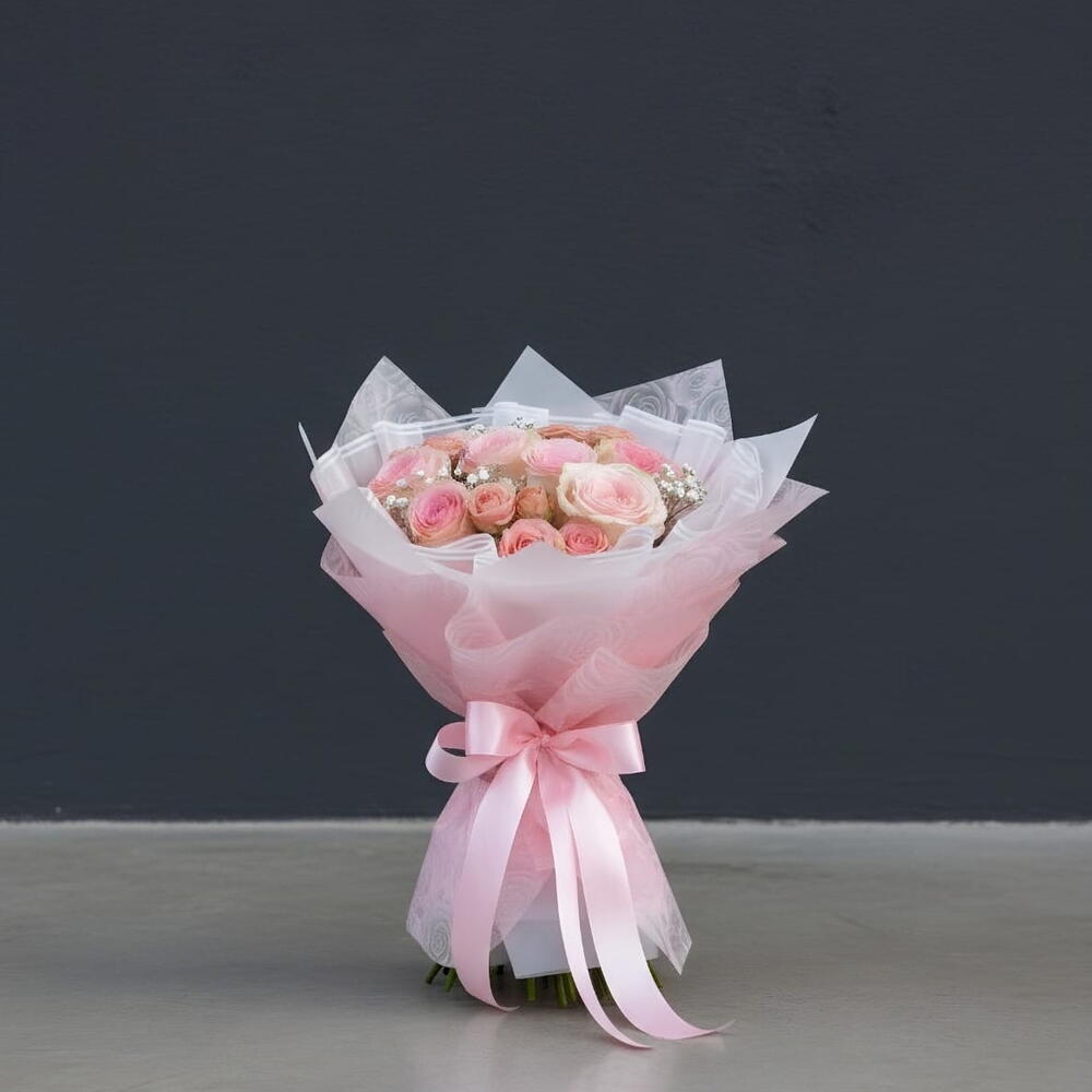 Букет — пышная, элегантная композиция из нежно-розовых и кремовых роз с добавлением деликатных белых акцентов гипсофилы. Цветы завернуты в многослойную полупрозрачную розовую и белую тишью, что придаёт букету мечтательный, воздушный вид; композиция завершена большой розовой лентой, завязанной изящным бантом у основания. В целом образ романтичный, изысканный и визуально сладкий, идеально подходит для стильного подарка или торжества.