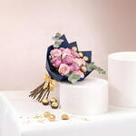Свежие розовые розы, оформленные зеленью и премиальными шоколадками, красиво упакованы для нежного и элегантного подарка. 3 шоколадки упакованы отдельно или могут быть помещены в букет.