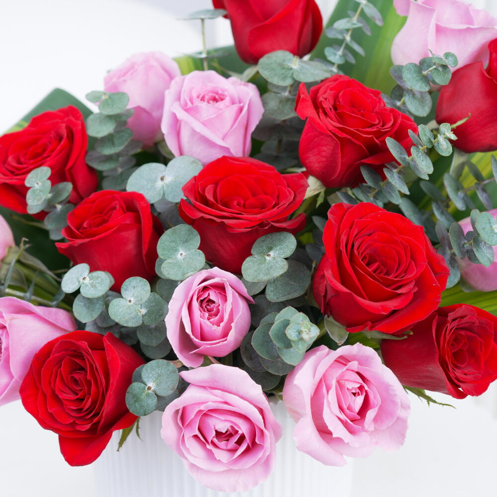 10 красных роз, 9 розовых роз, 5 листьев драцены массанджана и 8 листьев эвкалипта, оформленных в белом керамическом горшке.