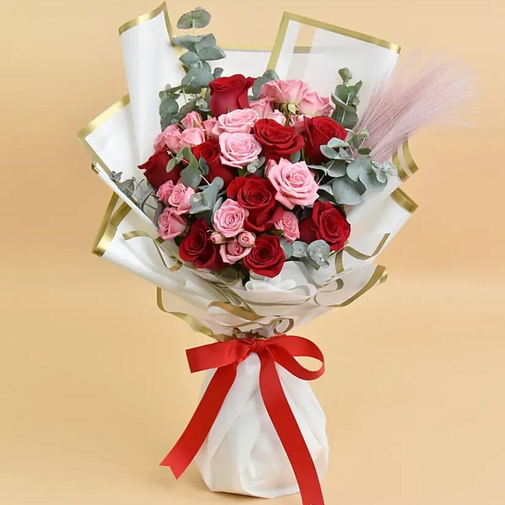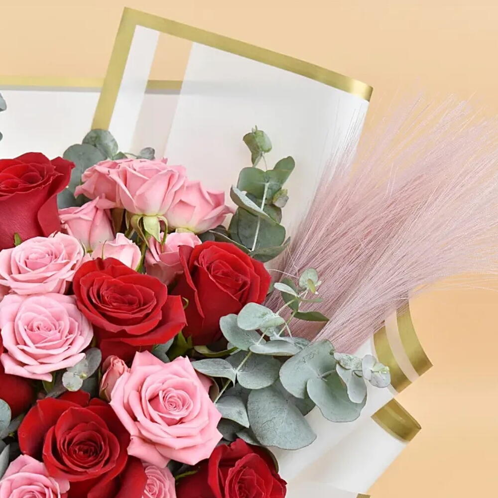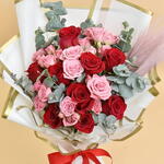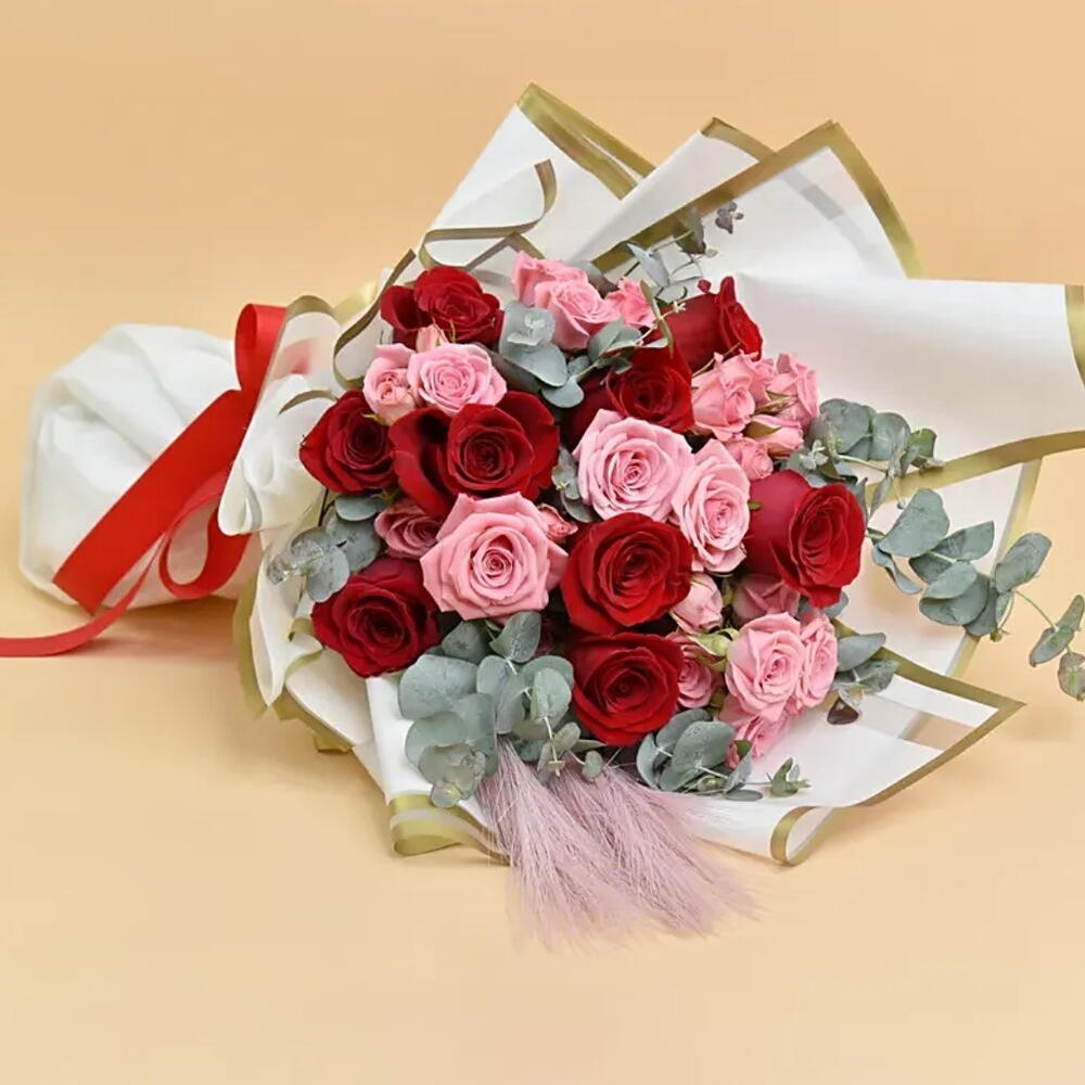 Букет "Романтичный румянец" 10 красных роз 4 светло-розовые кустовые розы Кортадерия пампасная, сухоцвет Эвкалипт цинереа Упакован лентой "Элегантность"