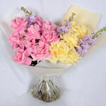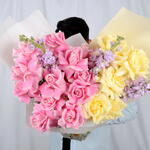 Pink rose - 10 шт. маттиола фиолетовая - 4 шт. желтые розы - 5 шт.