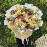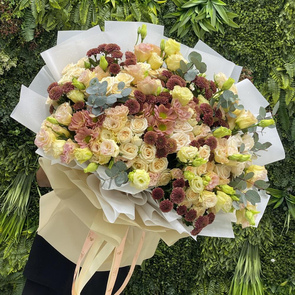 Lisianthus - 15 шт. eucalyptus leaves - 5 шт. персиковые мини-розы - 15 шт. хризантема в виде кнопки - 10 шт.