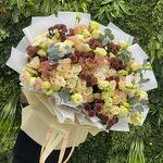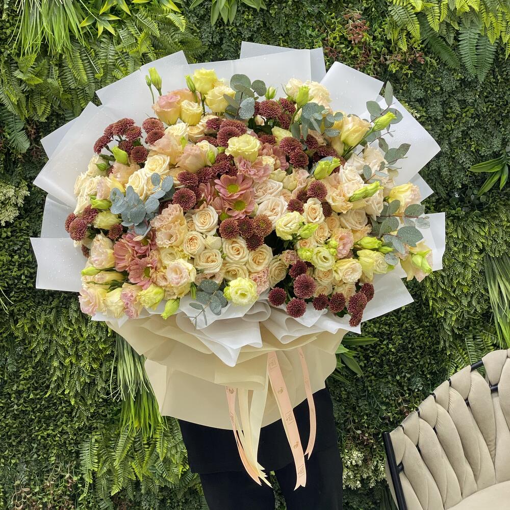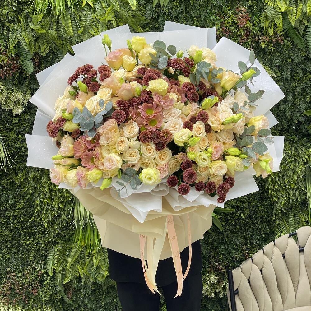 Потрясающая гармония мягких кремовых роз, пастельных персиковых бутонов и глубоких бордовых акцентов, изящно переплетённых с пышным эвкалиптом. Обёрнутый в слои белой элегантности и завершённый сатиновыми лентами, этот роскошный букет — шедевр романтики и утончённости, идеально подходит для празднования самых драгоценных моментов жизни.