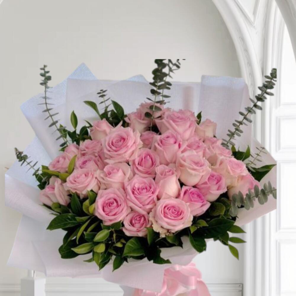 Букет из нежно-розовых роз, завернутый в белую бумагу