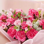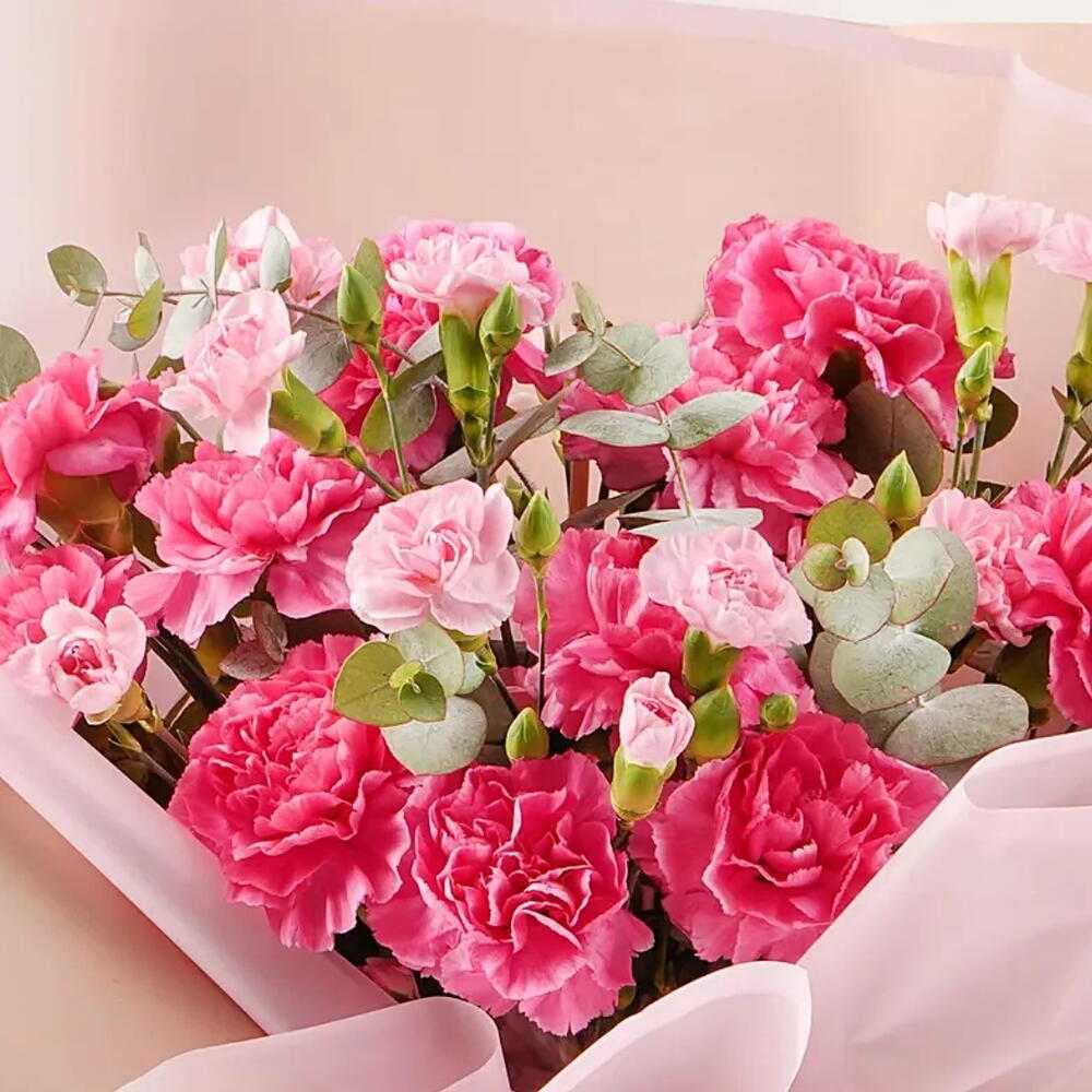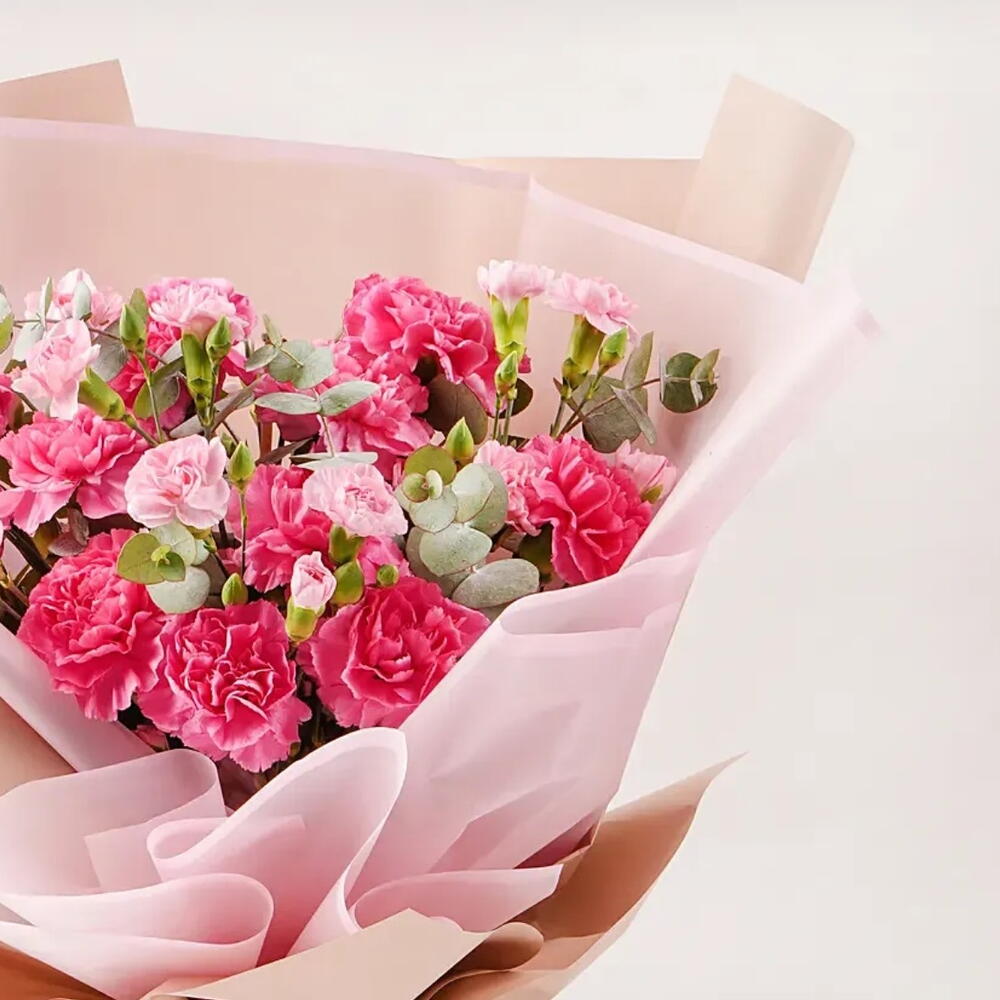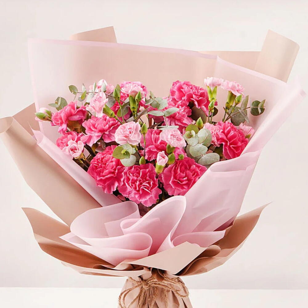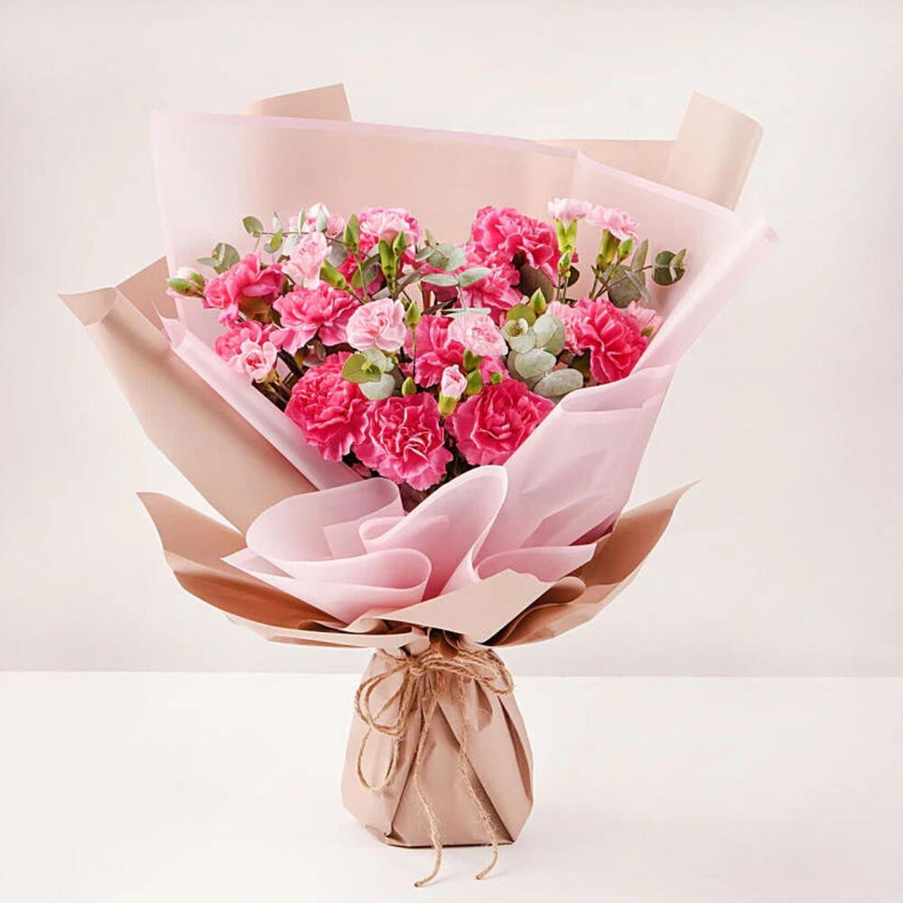 10 темно-розовых гвоздик 5 светло-розовых кустовых гвоздик 2 веточки эвкалипта Упакованы в элегантную джутовую обертку в деревенском стиле