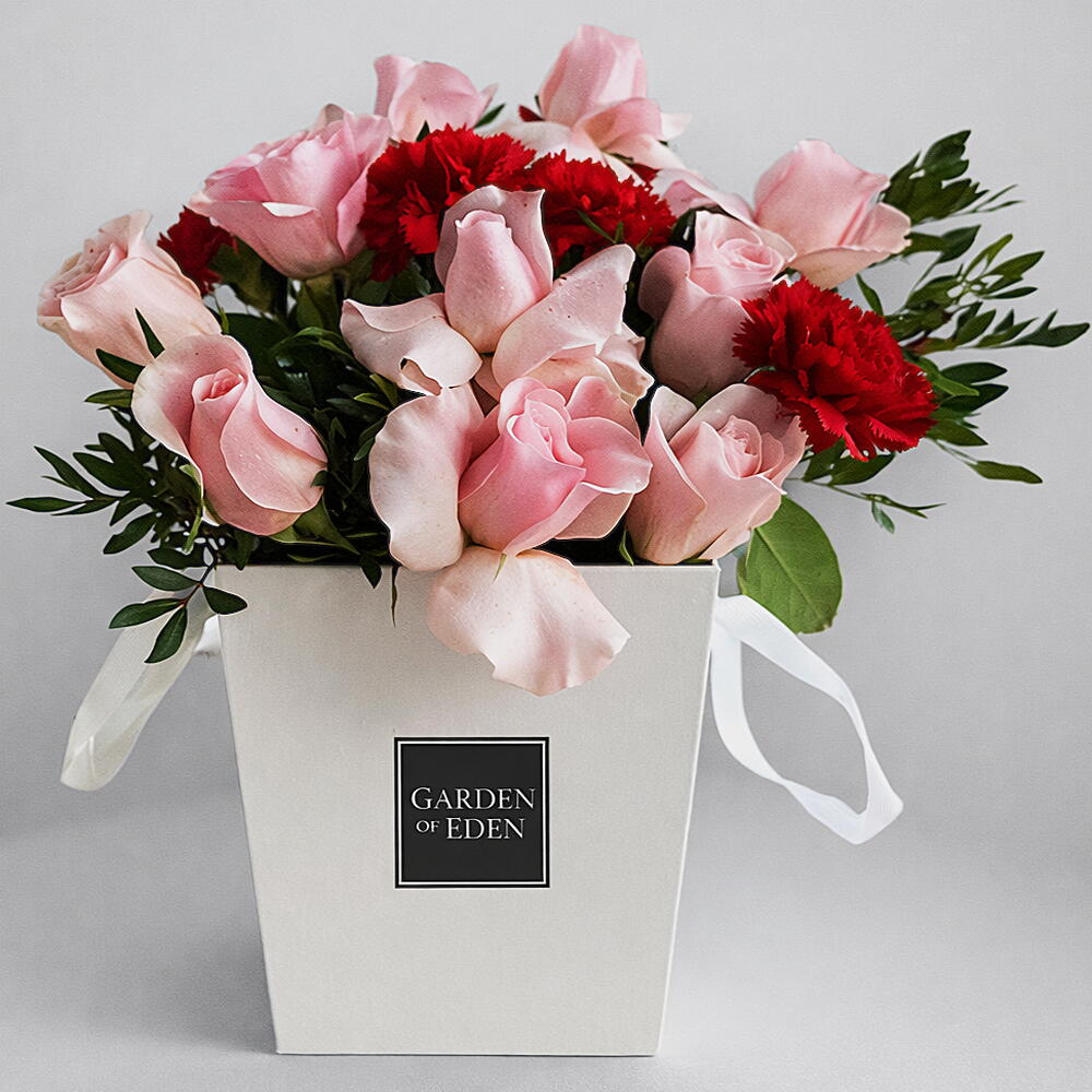 red carnations - 5 шт. pink roses - 10 шт.