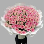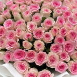 большой, роскошный букет преимущественно состоит из плотных кистей розового и белого оттенков, обычно идентифицируемых как сорт Esperance или похожего типа двухцветной спрей-розы. Крупные, махровые цветки имеют мягко-розовый центр с кремово-белыми или светло-зелёными внешними лепестками, что придаёт им антикварный или винтажный вид. Букет искусно оформлен в плотную круглую композицию и завернут в элегантную белую бумагу с подходящей лентой, стиль, часто используемый для пышных жестов или значимых событий.