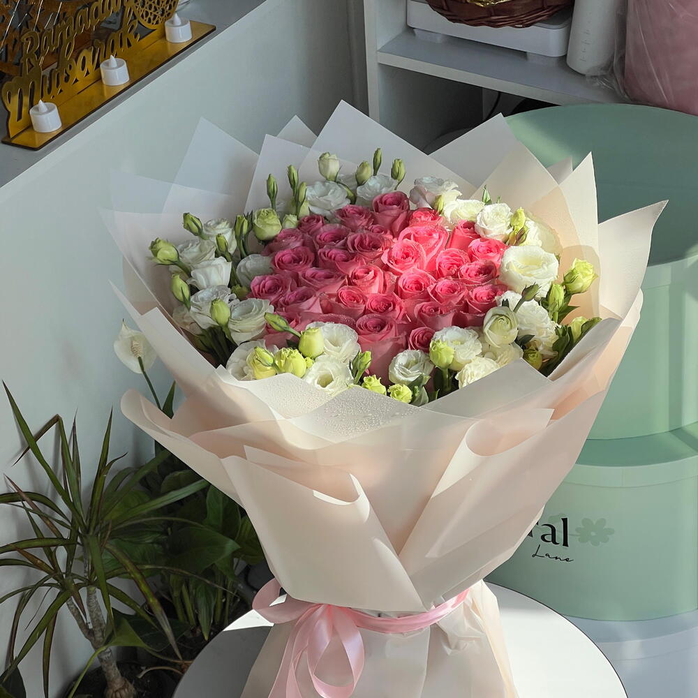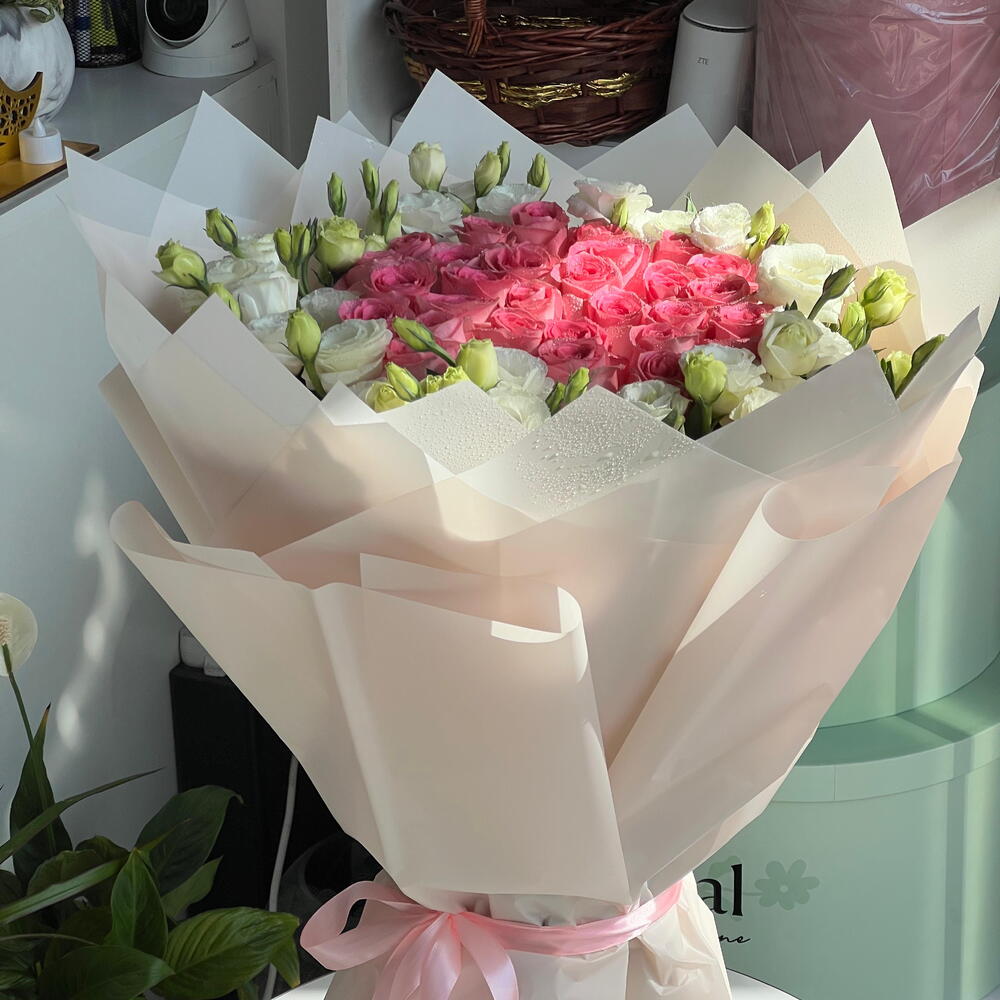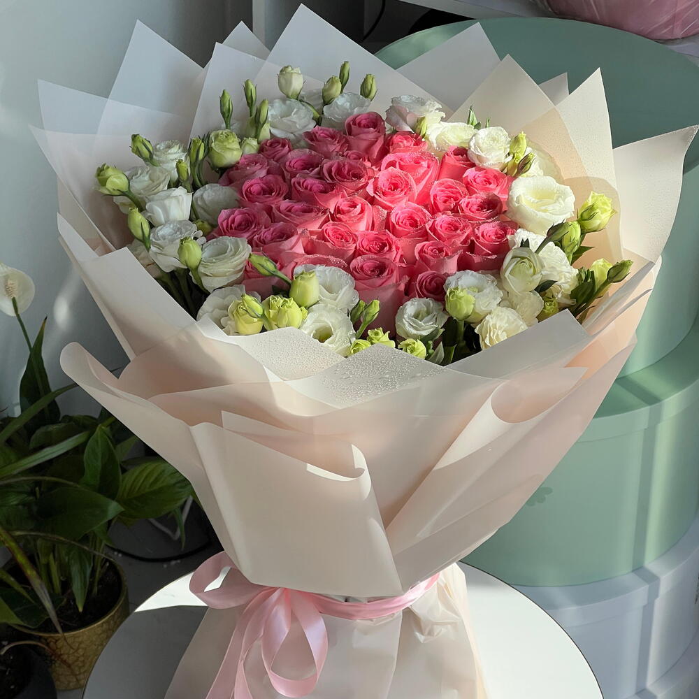 white lisianthus - 10 шт. pink roses - 31 шт.