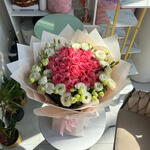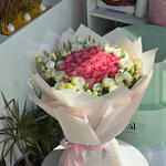 Потрясающая композиция, в которой 31 премиальная роза розового цвета уложена в форме сердца, символизируя глубокую привязанность и изящество. Окутанная деликатным венцом из 12 белых лизиантусов с рюшами, эта композиция предлагает поразительный контраст фактуры и оттенков. Завершённая элегантной кремовой бумагой и шелковой лентой, она является пышным романтичным шедевром, идеально подходящим для создания незабываемого впечатления.