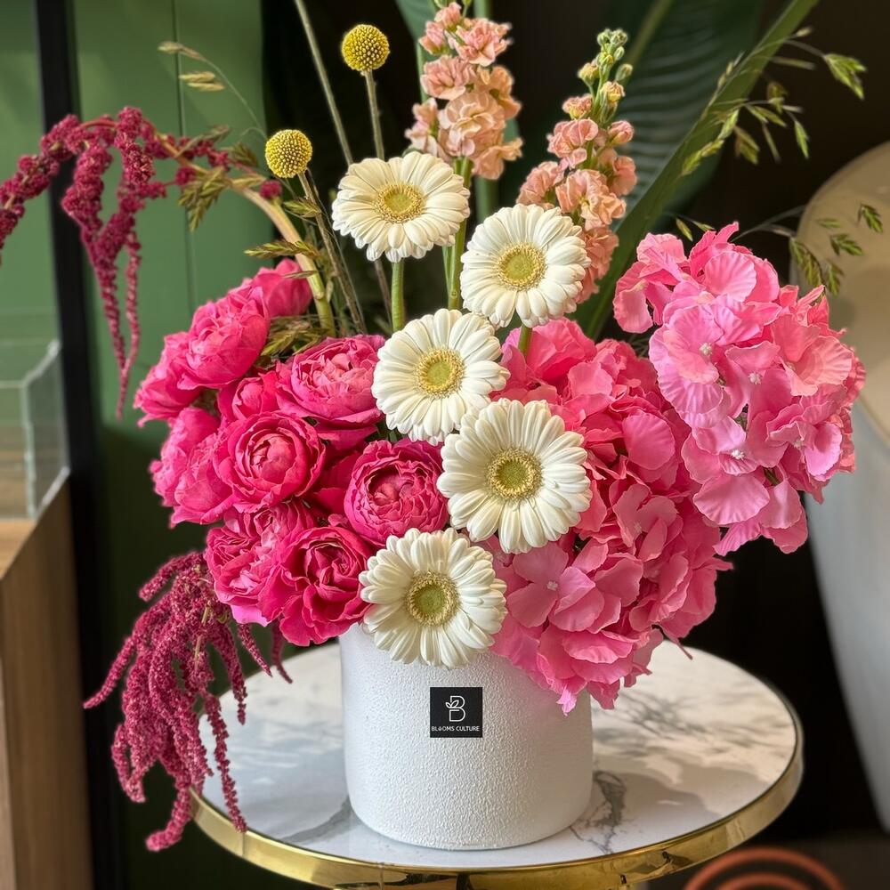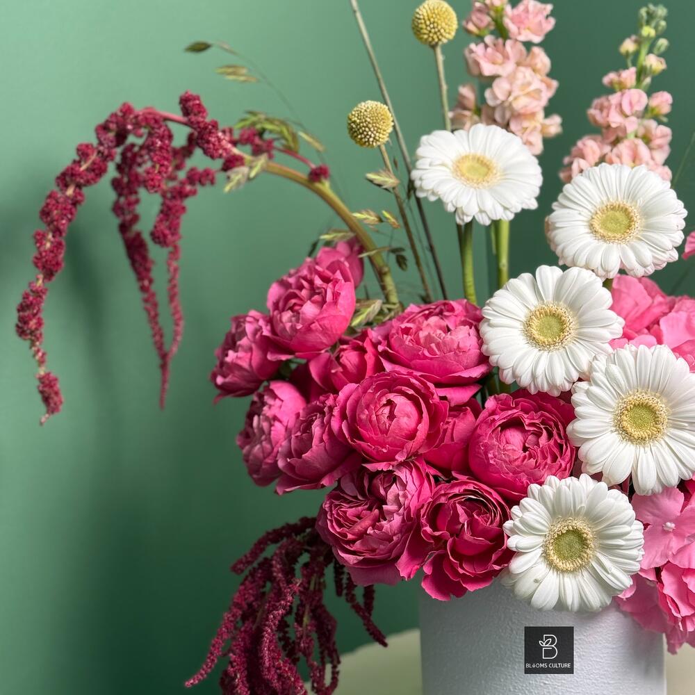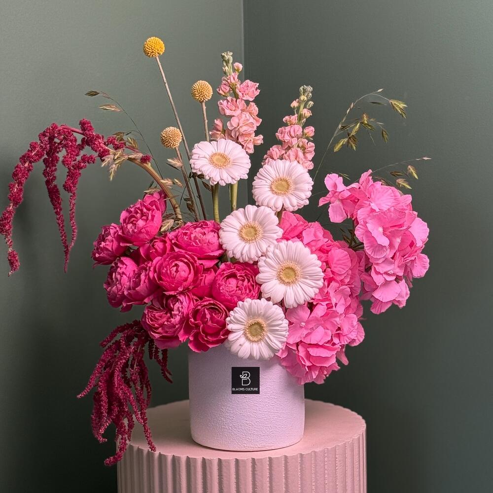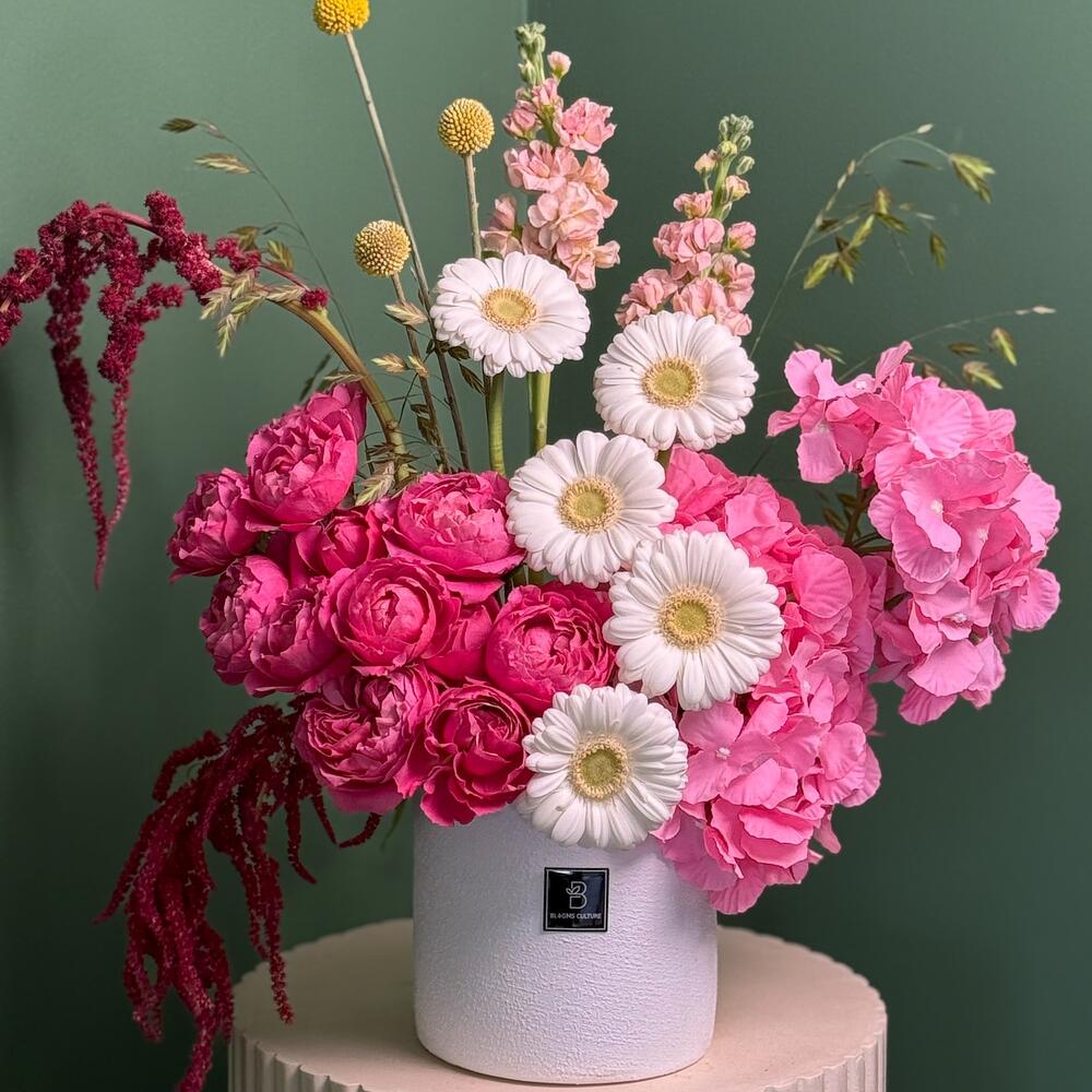 Изящный танец мягких оттенков и вневременной элегантности. Композиция Blushing Porcelain включает прекрасно выполненную керамическую вазу в тёплой белой глазури, служащую идеальным фоном для романтичного сочетания румяно-розовых пионов, сливочно-белых роз и нежных кустовых роз. Эта композиция воплощает нежную утончённость, привнося в любое пространство нотку спокойной и мечтательной красоты.