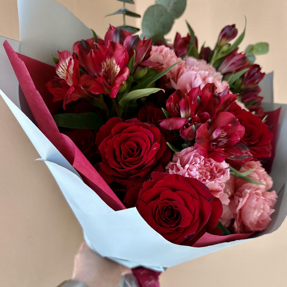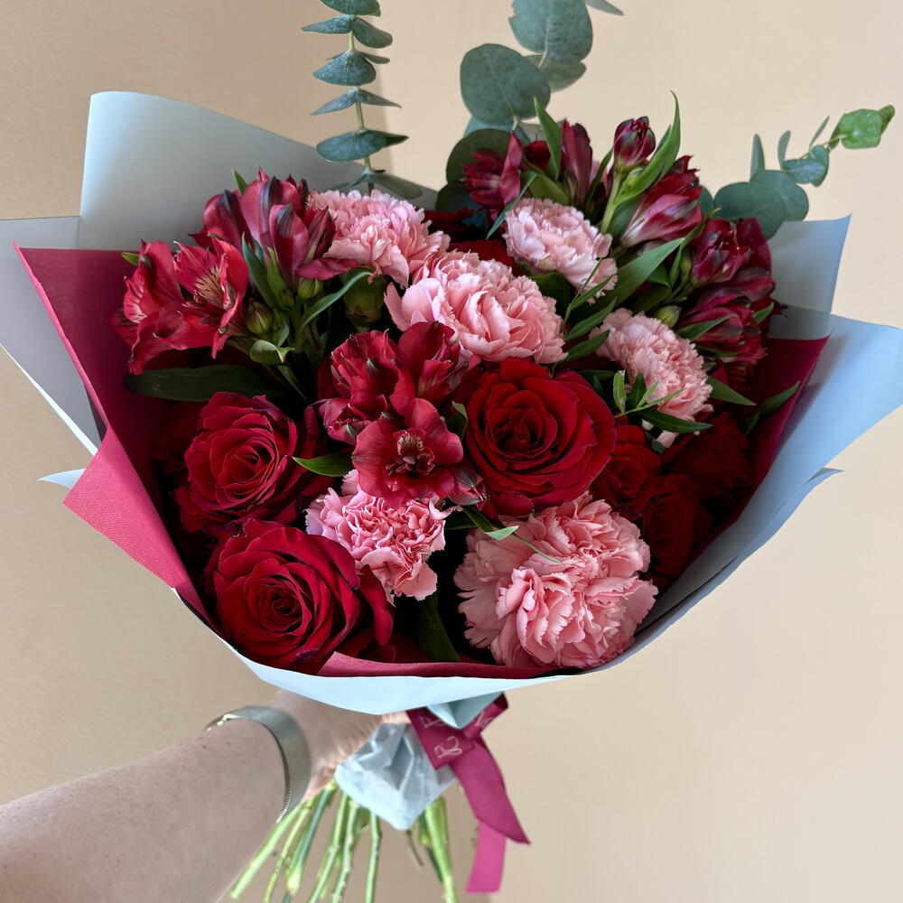 Blushing Romance large bouquet with red roses , carnations, alstromeria