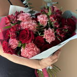Pistachio - 1 шт. eucalyptus stems - 3 шт. red roses explorer kenya - 17 шт. carnation dulcinea - 7 шт. wrapping paper large - 1 шт. alstroemeria deep red - 4 шт.