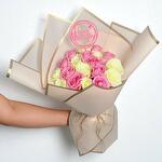 Радостная композиция из 10 белых и 10 розовых роз, дополненная весёлой палочкой «С Днём Рождения» — идеальный цветочный подарок, чтобы отпраздновать особенного человека с элегантностью и любовью.