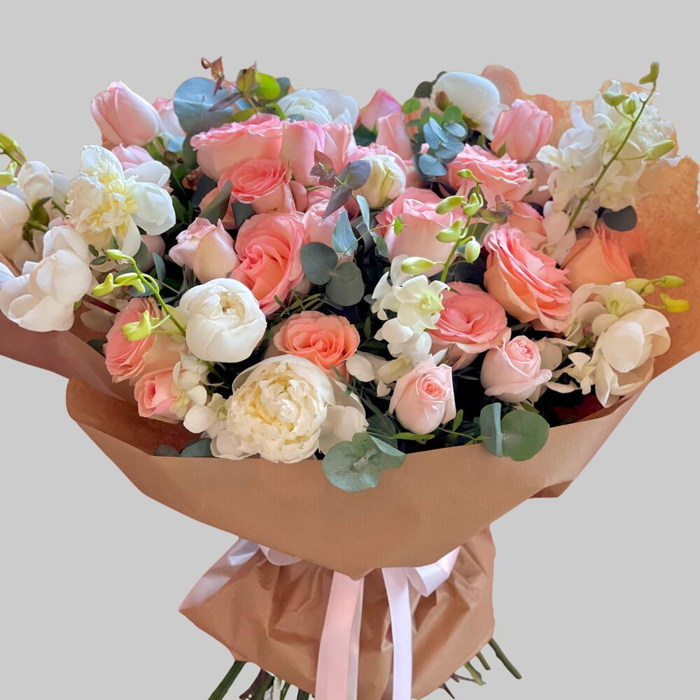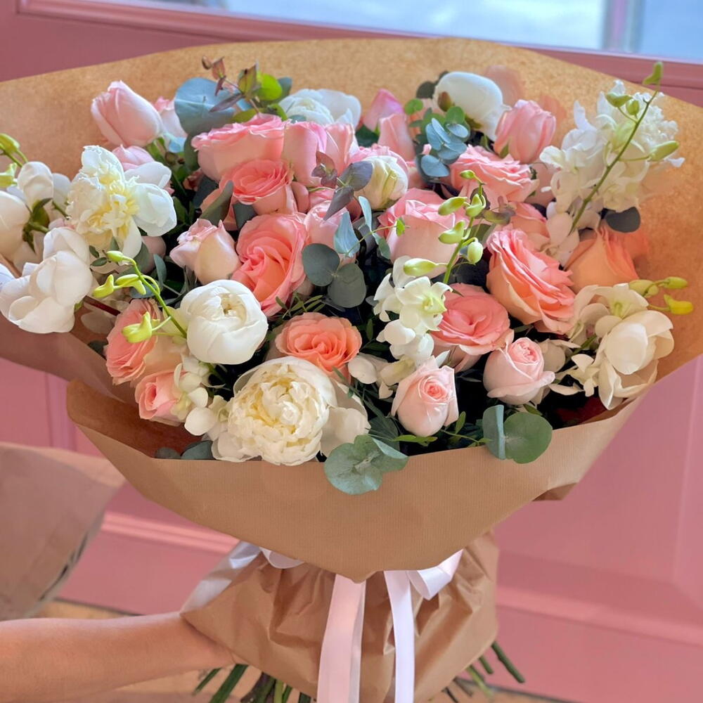 Потрясающая смесь розовых и белых цветов, включая пионы, розы, орхидеи дендробиум и роскошный эвкалипт, чтобы она улыбалась несколько дней! По-настоящему элегантный букет для любого случая или вовсе без повода, просто чтобы она улыбнулась! ПОЖАЛУЙСТА, ОБРАТИТЕ ВНИМАНИЕ: Так как цветы имеют разные сезоны, не все цветы могут быть доступны круглый год. Если это произойдёт, мы всегда заменим их цветами равной или большей стоимости схожих оттенков и обеспечим, что букет по-прежнему будет таким же потрясающим.