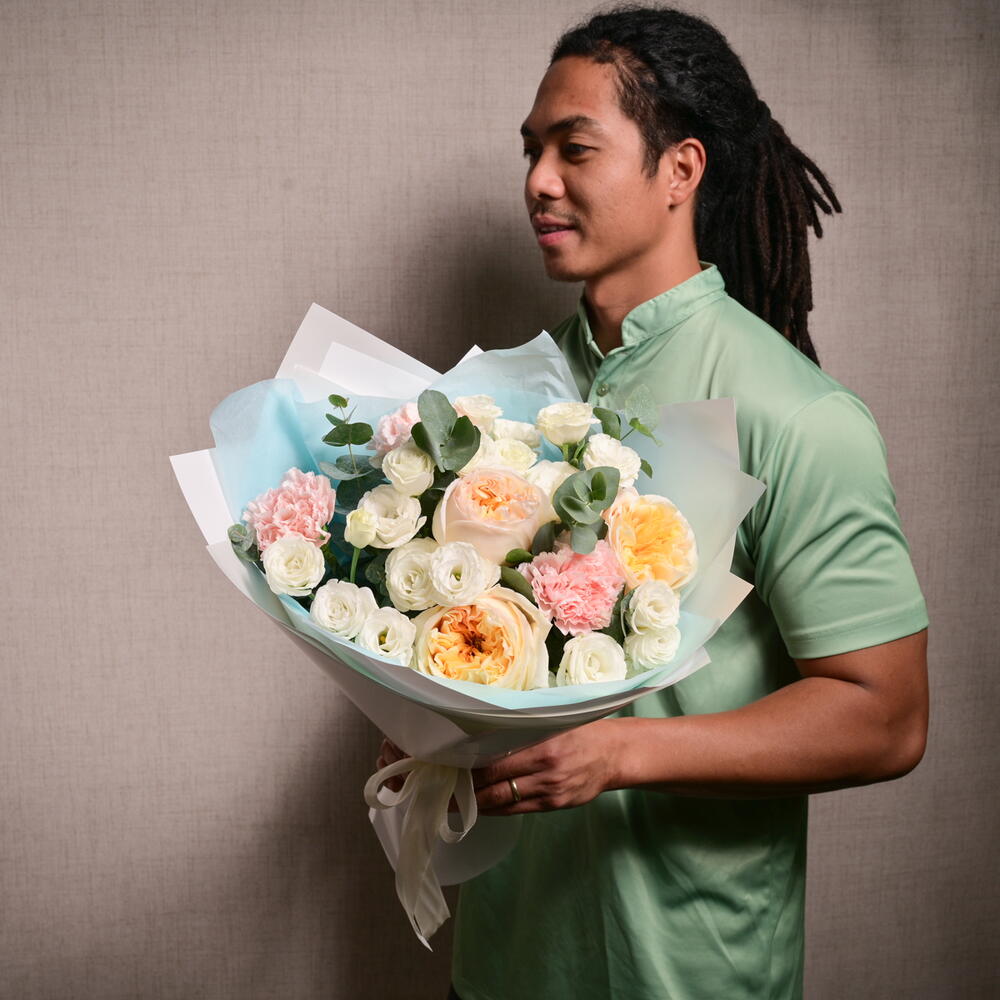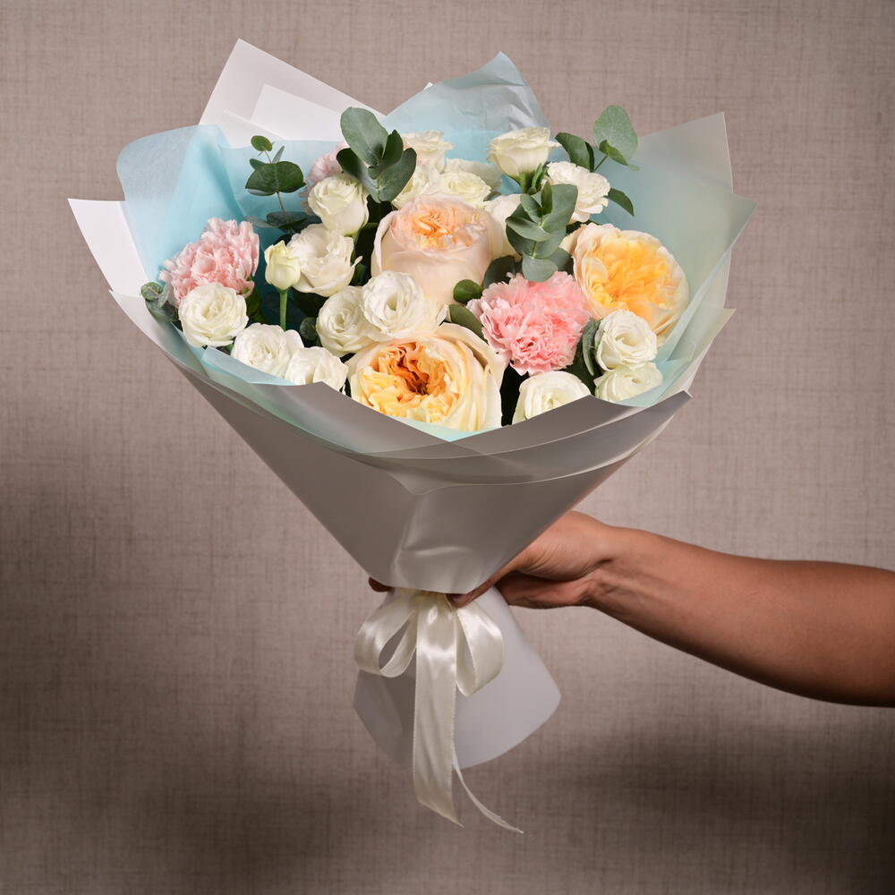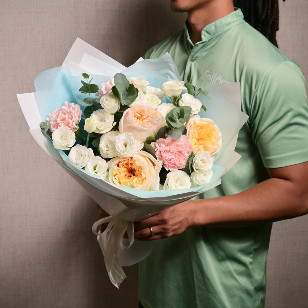 Почувствуйте красоту природы с букетом Bohemian Blue от Fellora Flower Boutique. Эта элегантная композиция состоит из 3 отборных персиковых роз, 3 розовых гвоздик, 3 белых лизиантуса и 2 листьев эвкалипта. Она изящно упакована в 4 листа белой и 2 листа синей папиросной бумаги. Нежные пастельные оттенки и свежие цветы делают этот букет идеальным подарком на любой случай, добавив нотку богемного очарования вашему празднику.