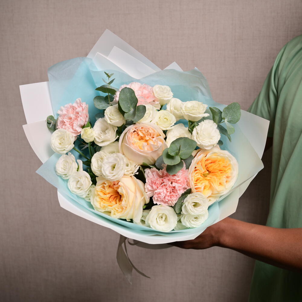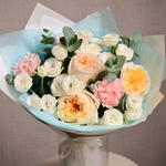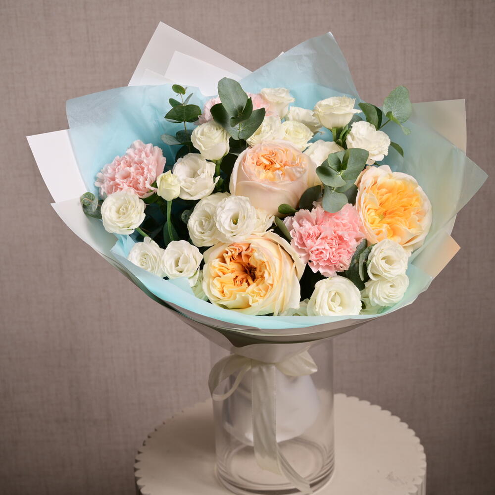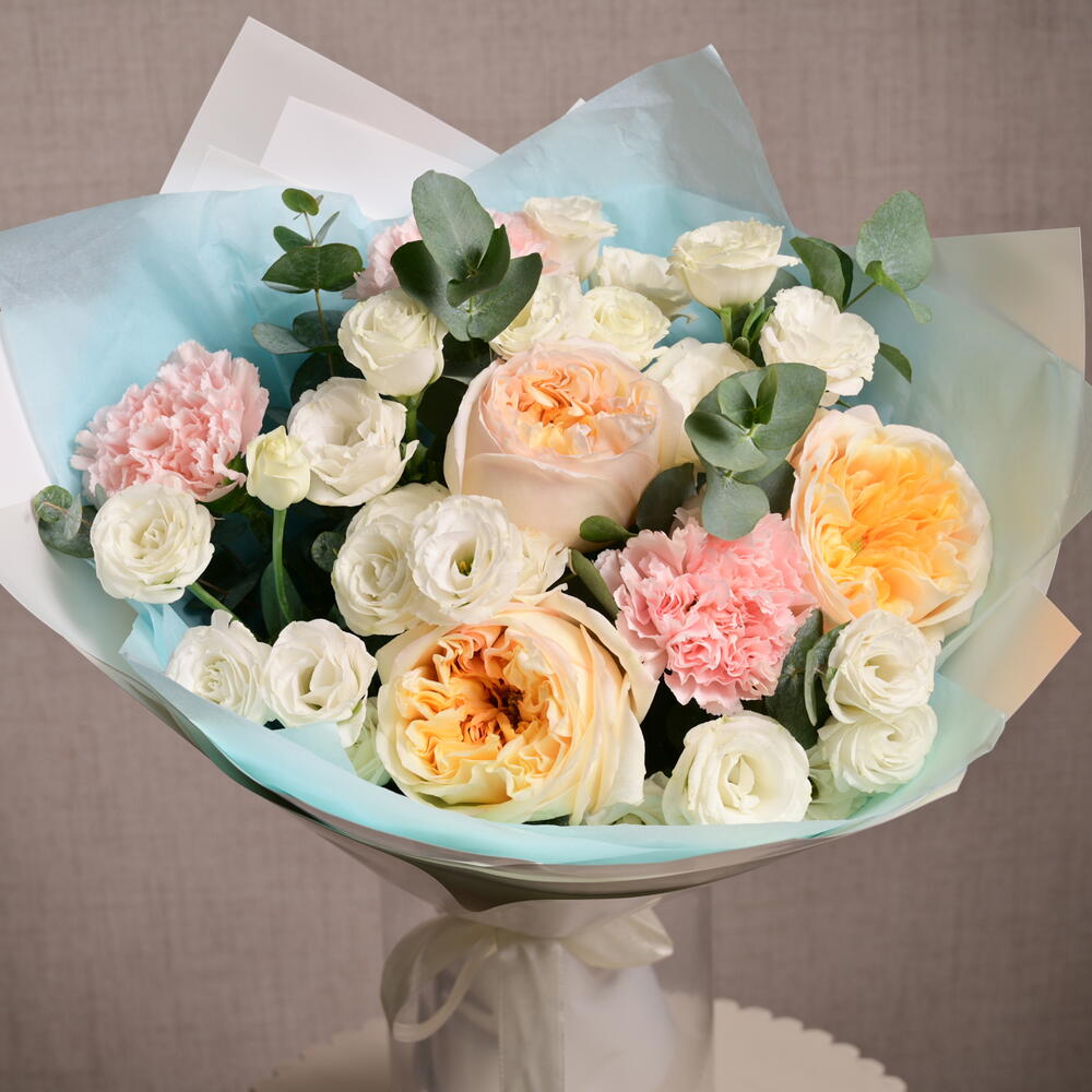 Ribbon - 1 шт. lisianthus white - 3 шт. pink carnation - 3 шт. премиальные персиковые розы - 3 шт. 2 эвкалипта - 2 шт. белая упаковочная бумага - 4 шт. синие салфетки - 2 шт.