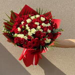 Этот захватывающий букет сочетает вечную страсть красных роз с чистой элегантностью белых цветов, создавая впечатляющую визуальную симфонию. Обёрнутый в насыщенную красную бумагу и дополненный тропической зеленью, Scarlet Elegance излучает тепло, романтику и изысканность. Каждая роза отбирается вручную по критериям свежести и пышной красоты, делая эту композицию настоящим центром внимания. Будь то грандиозный романтический жест или искреннее торжество, этот букет дарит эмоции в каждом лепестке. Идеальный выбор для годовщин, предложений или любого момента, который стоит запомнить. Пусть ваша любовь звучит громче слов с этим смелым и прекрасным цветочным шедевром.