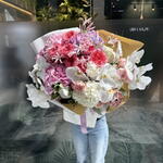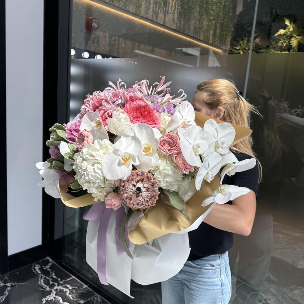 Composition: Protea - 1, Hydrangea - 7, Phalaenopsis - 2, Narine - 5, Rose Pink Expression - 7, Pittosporum - 5, Peony import pink - 1, Spray Rose Julieta peach - 3 Sizes: WIDTH - 65CM; HEIGHT - 65CM; LENGTH - 65CM; (including packaging) Размер: 65 x 65 x 65 см