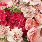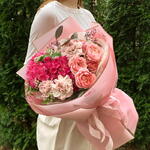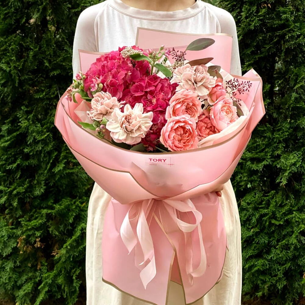Composition: Hydrangea - 1, Spray Rose Julieta peach - 2, Dianthus Space Dyed - 3, Oxypetalum - 3, Eucalyptus - 1, ribbon - 2, WRAPPING - 4 Sizes: WIDTH - 40CM; HEIGHT - 55CM; LENGTH - 55CM; (including packaging) Размер: 40 x 55 x 55 см